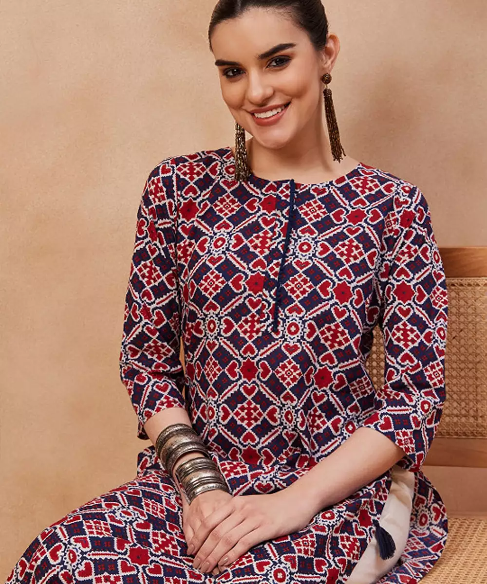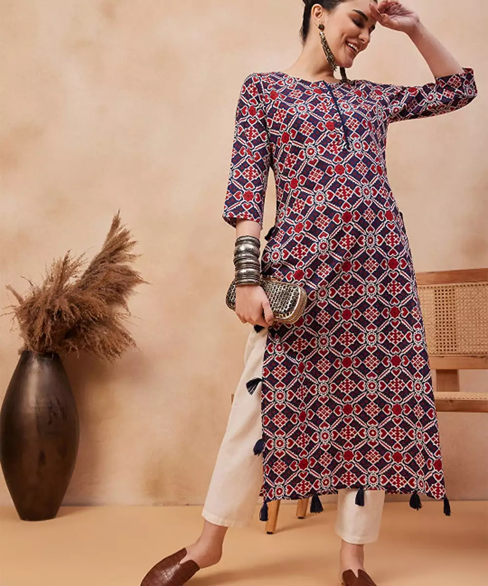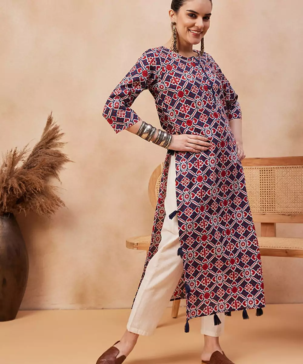 Navy Blue Ethnic Motifs Printed Cotton Straight Kurta