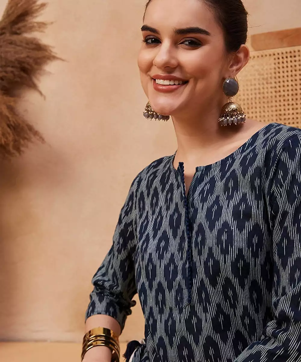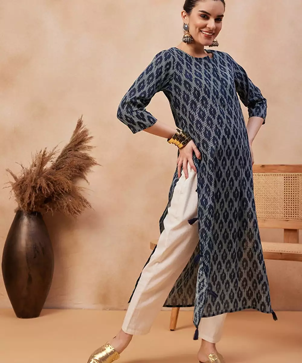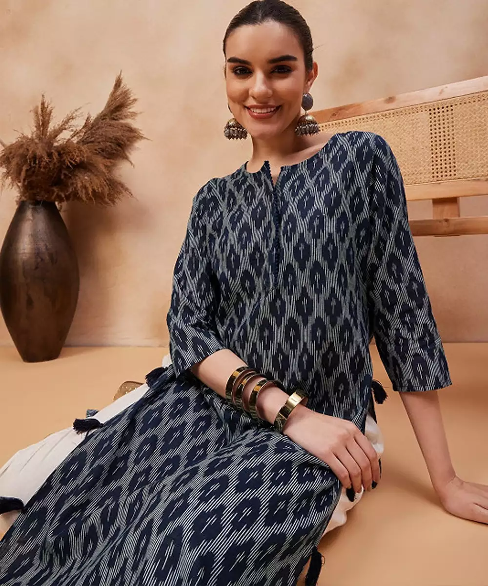 Navy Blue Ethnic Motifs Printed Cotton Straight Kurta