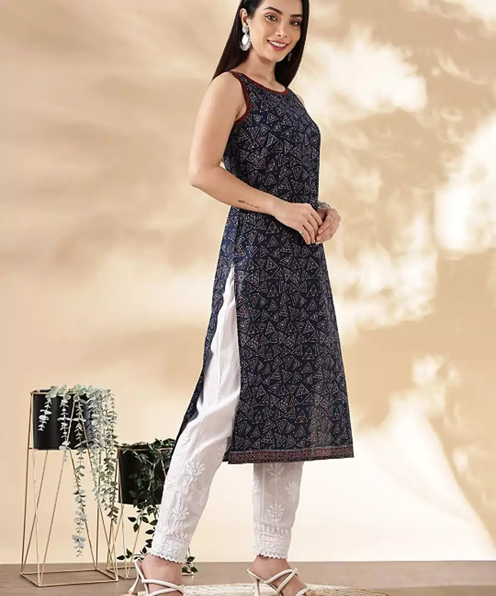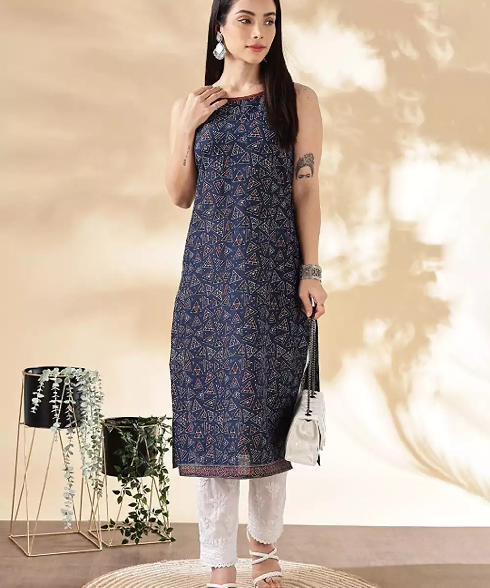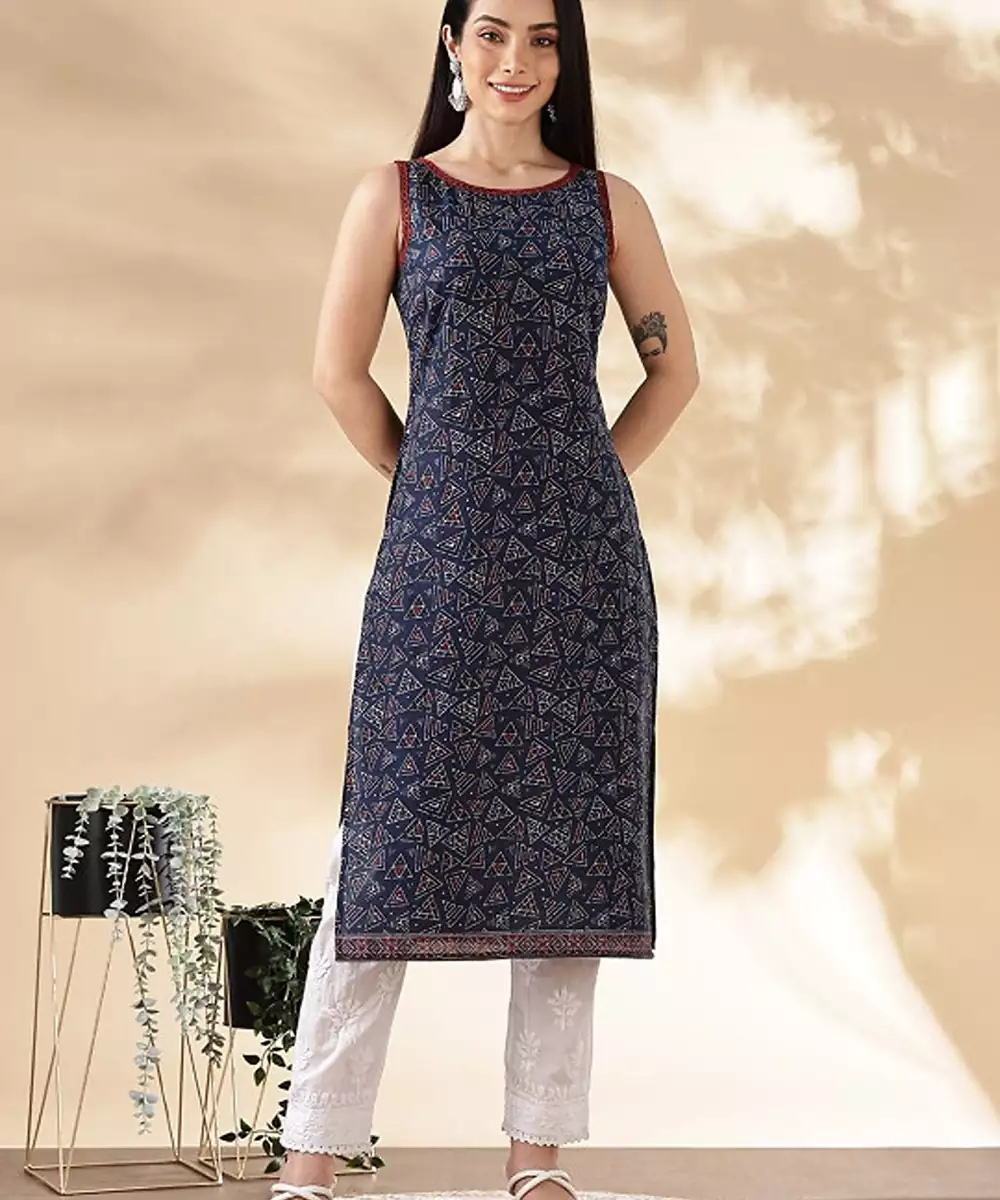 Navy Blue Geometric Printed Boat Neck Straight Kurta