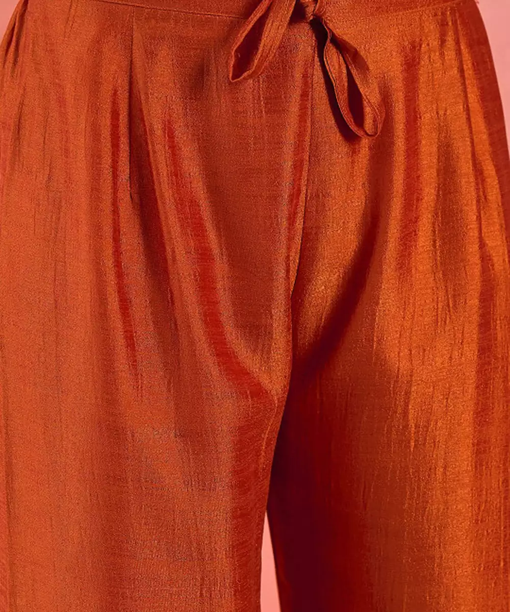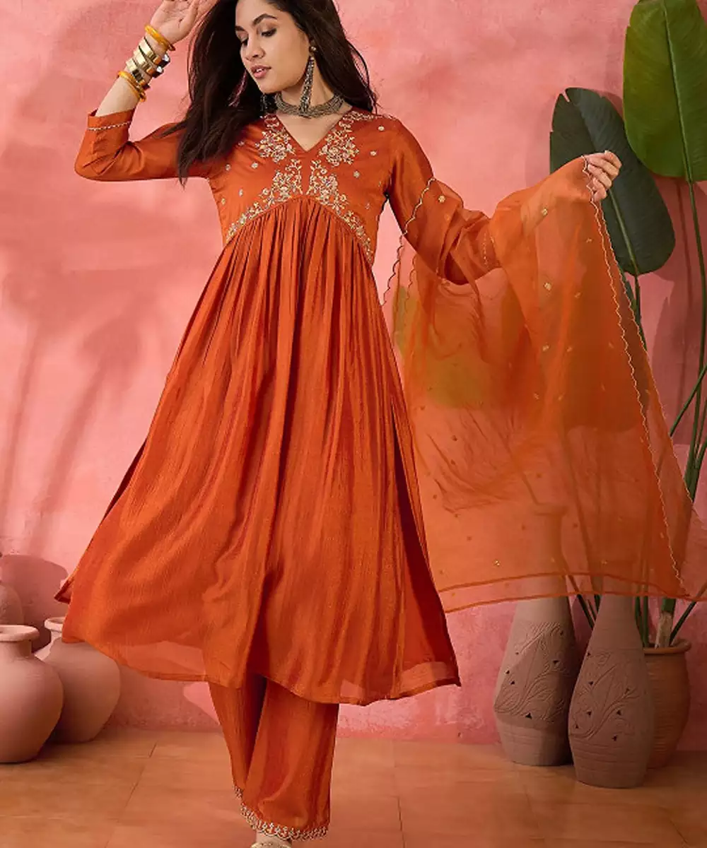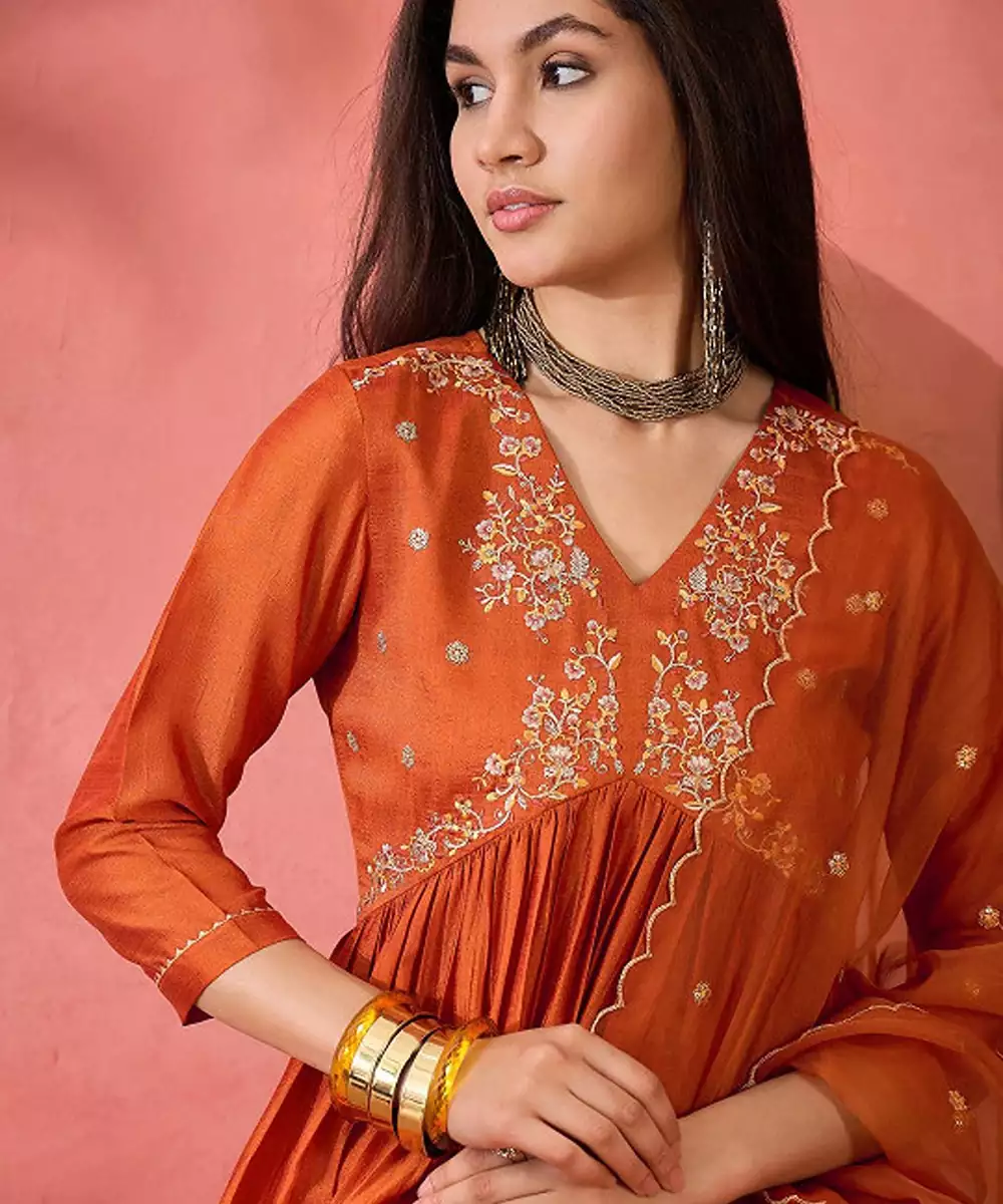 Orange Floral Embroidered V Neck A Line Kurta With Trousers And Dupatta