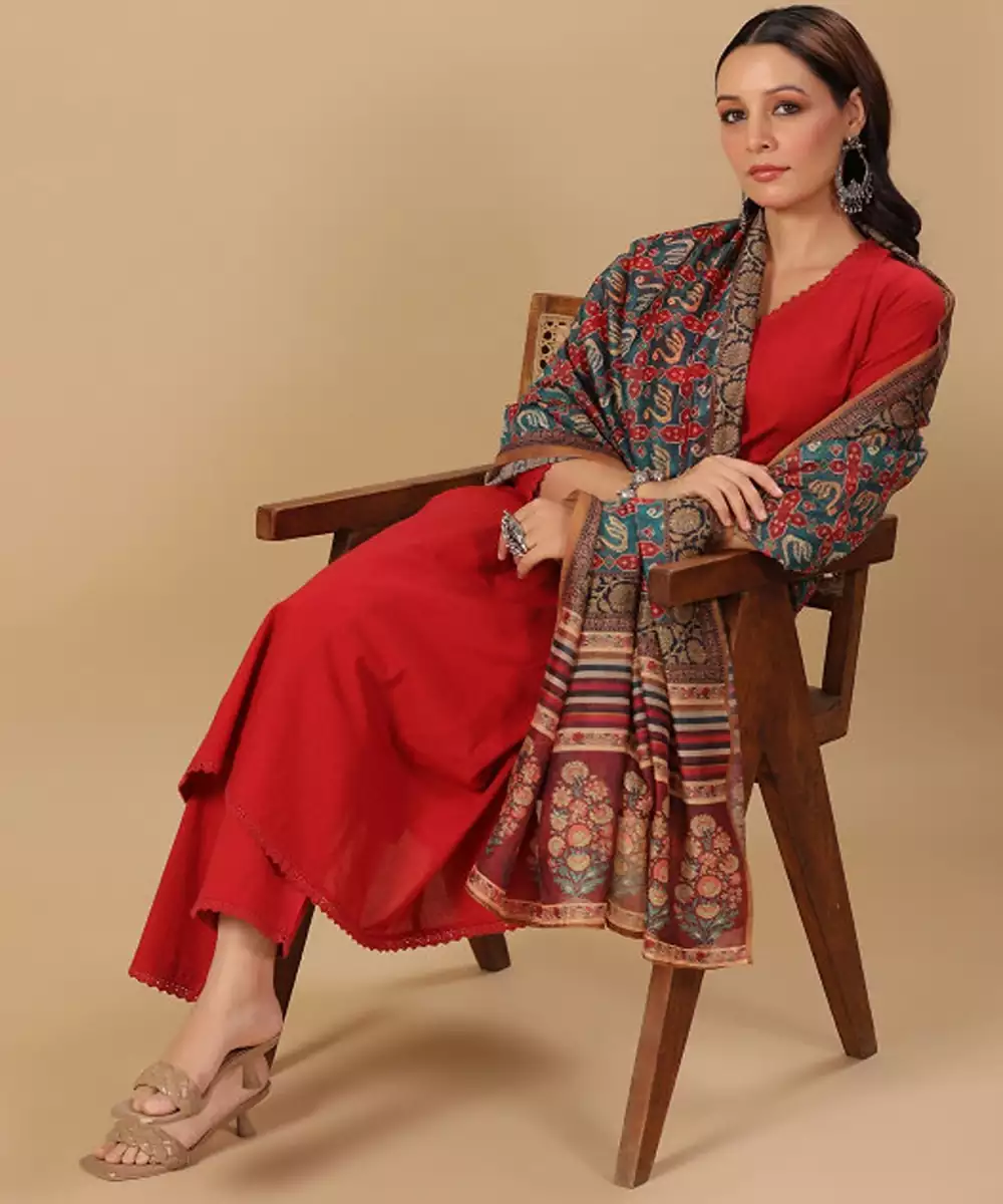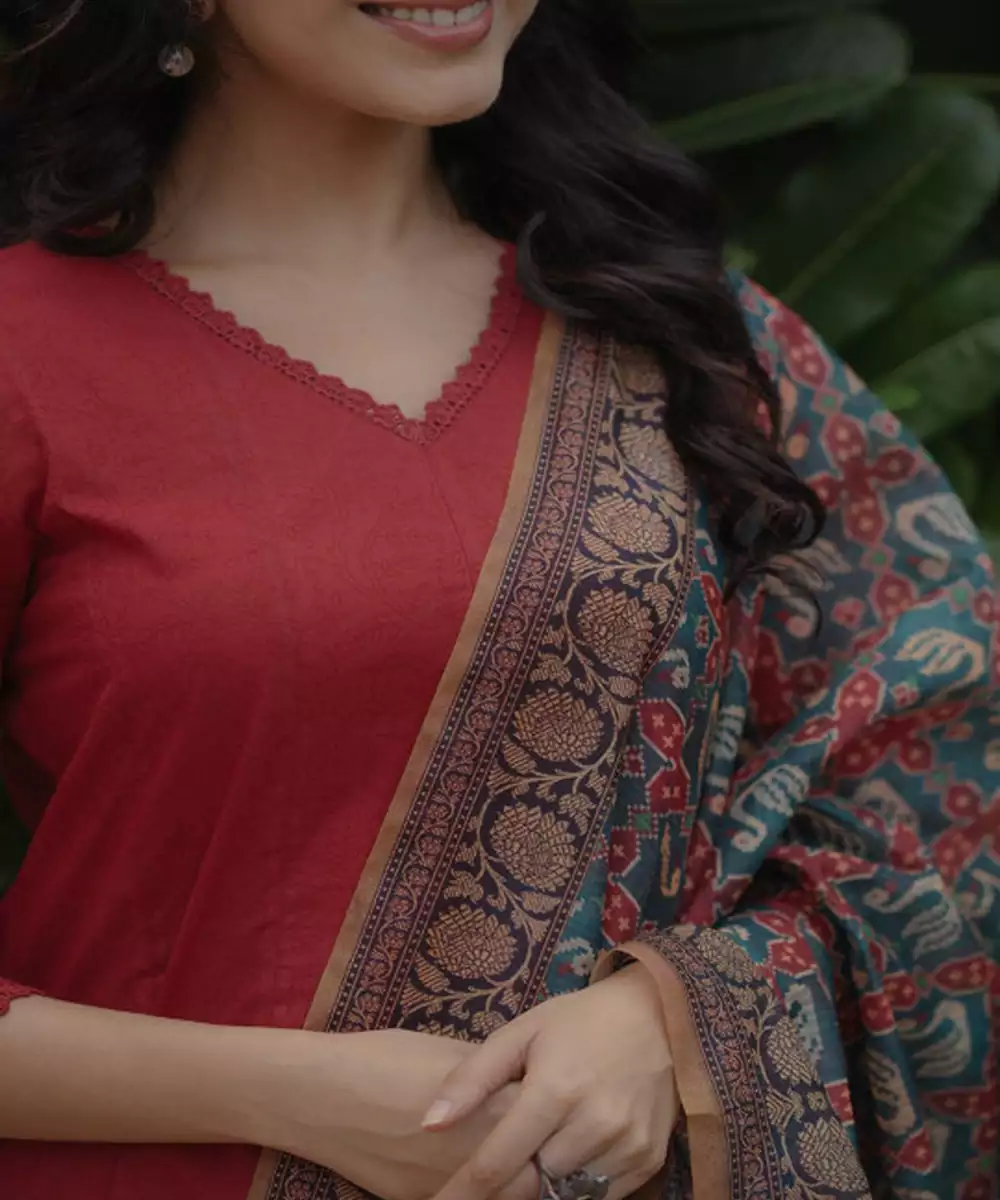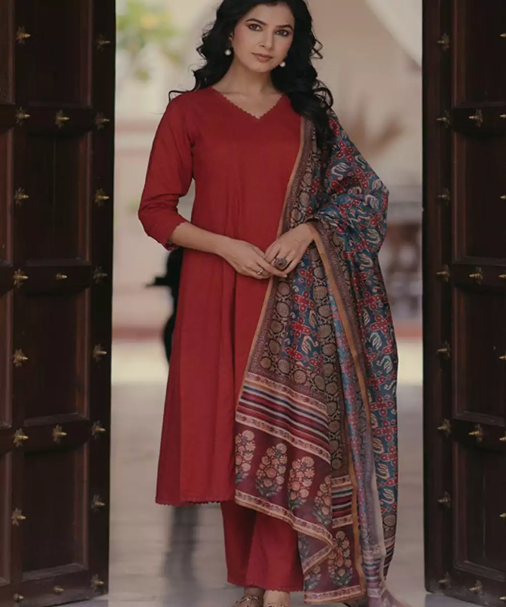 Red Solid Kurta With Trousers With Dupatta Kurta Design: