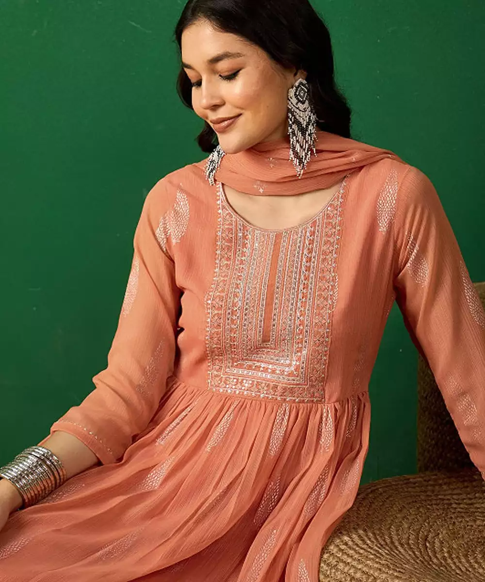 Peach Floral Embroidered A Line Kurta With Trouser & Dupatta