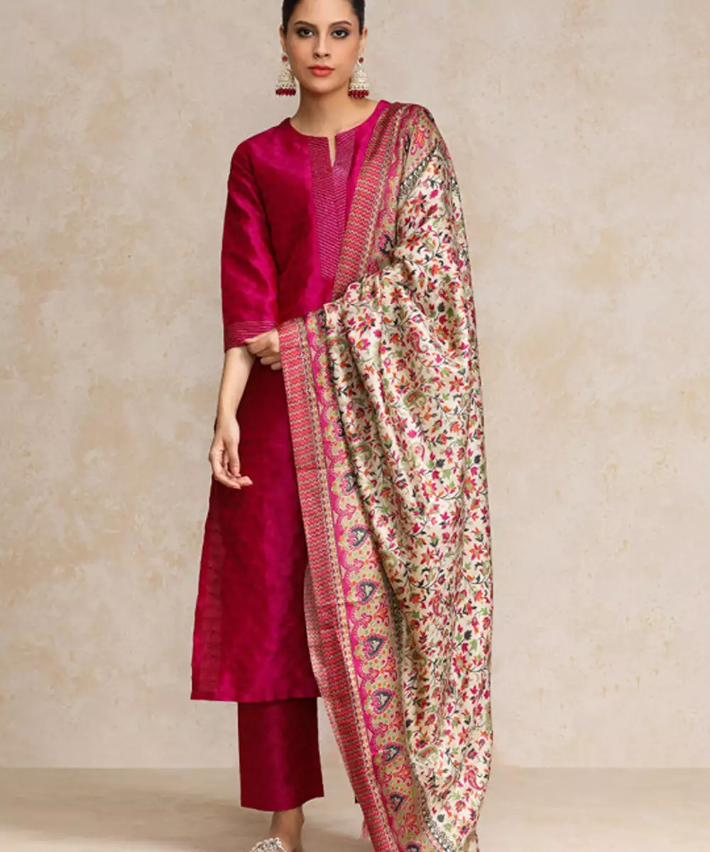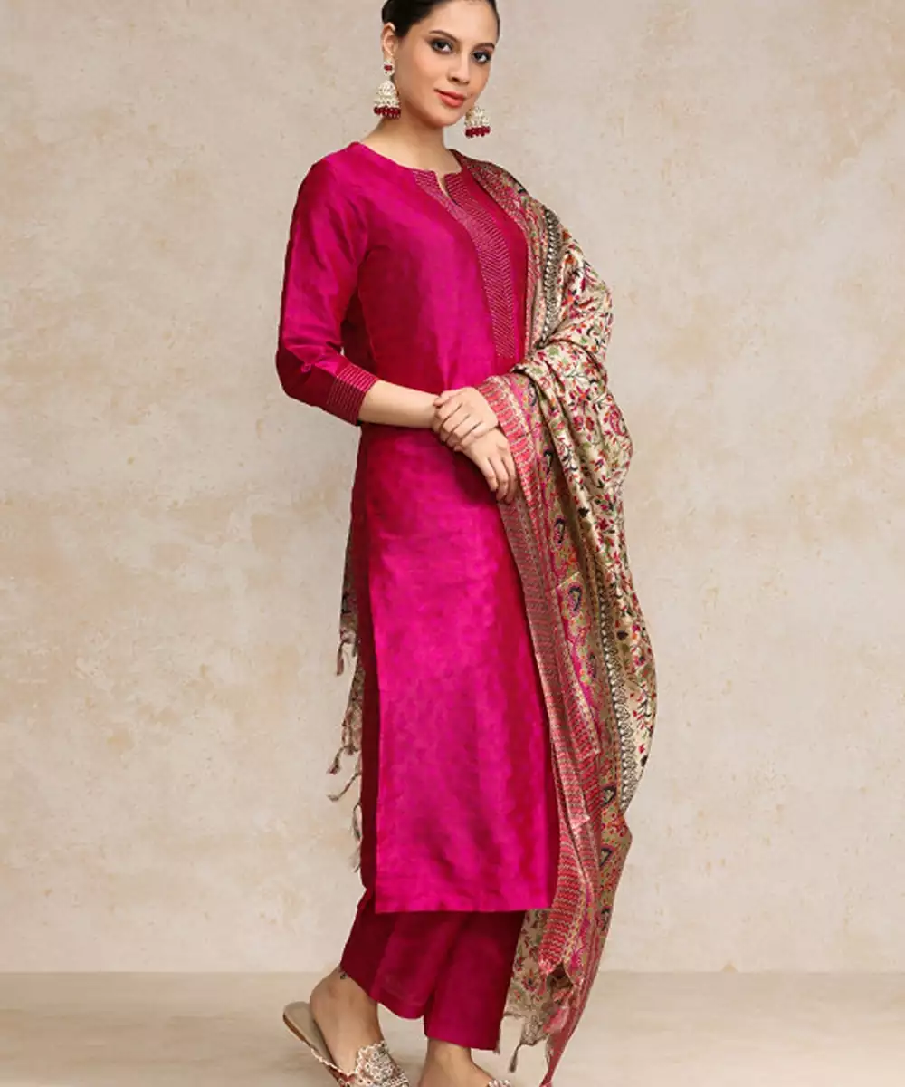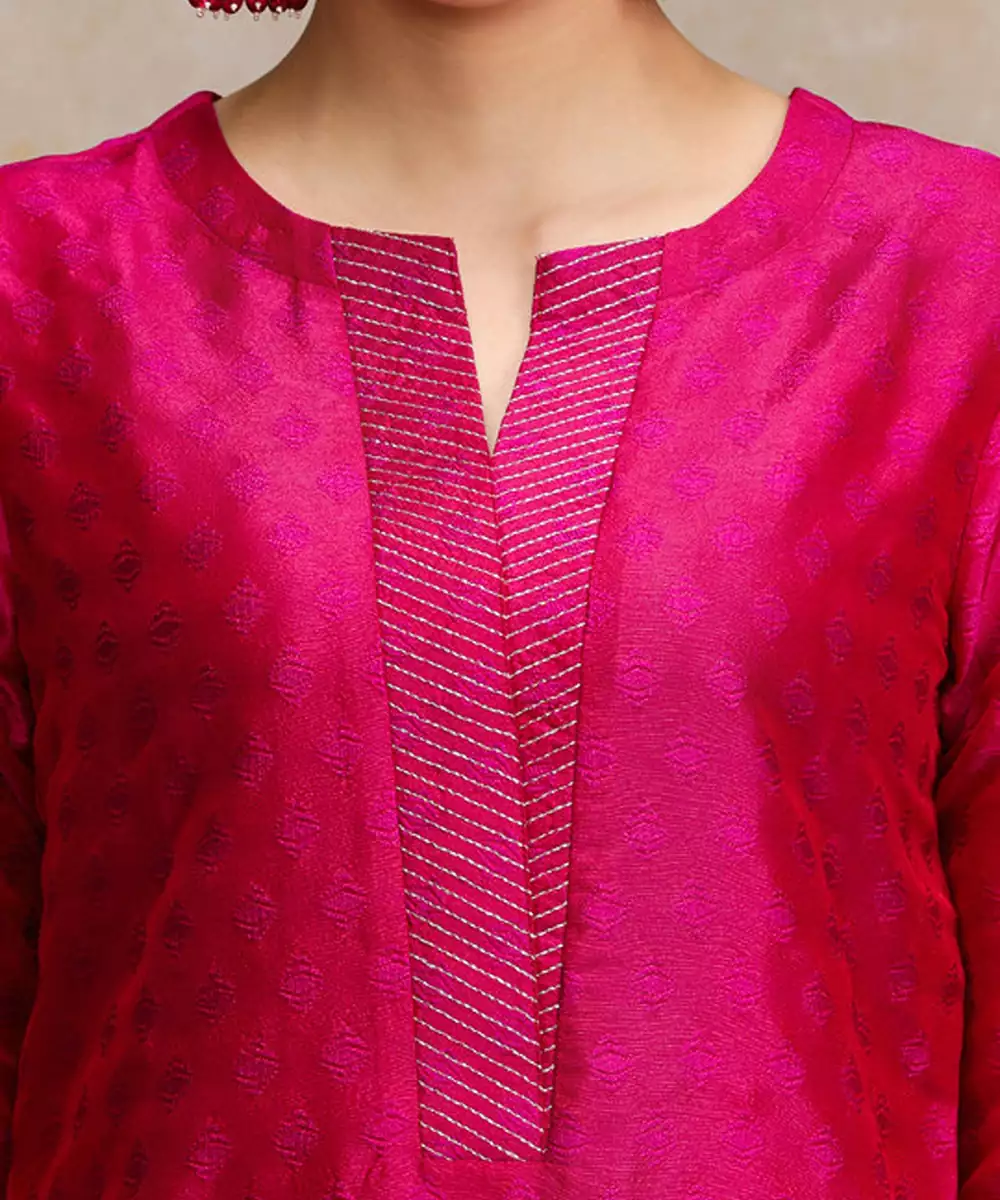 Pink Zari Work Textured Kurta With Trouser And Printed Dupatta