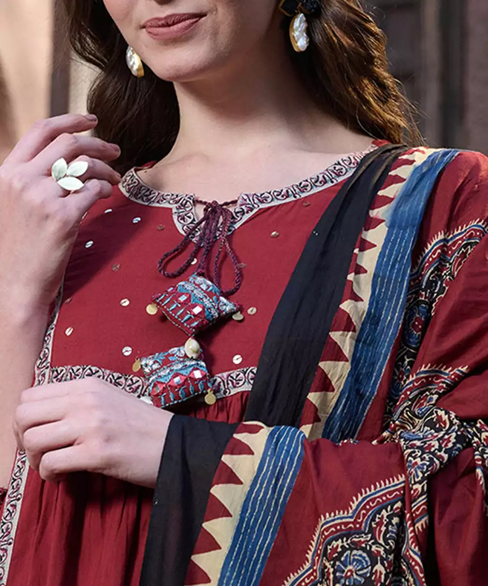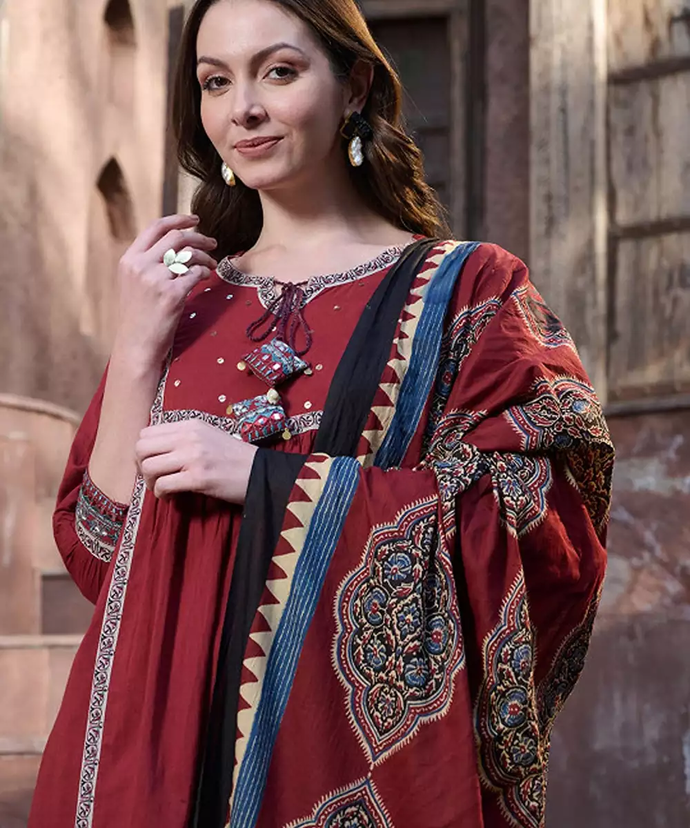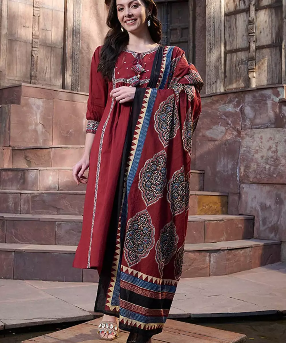 Maroon Solid Kurta With Trousers With Dupatta Kurta Design: