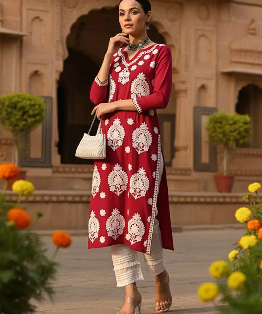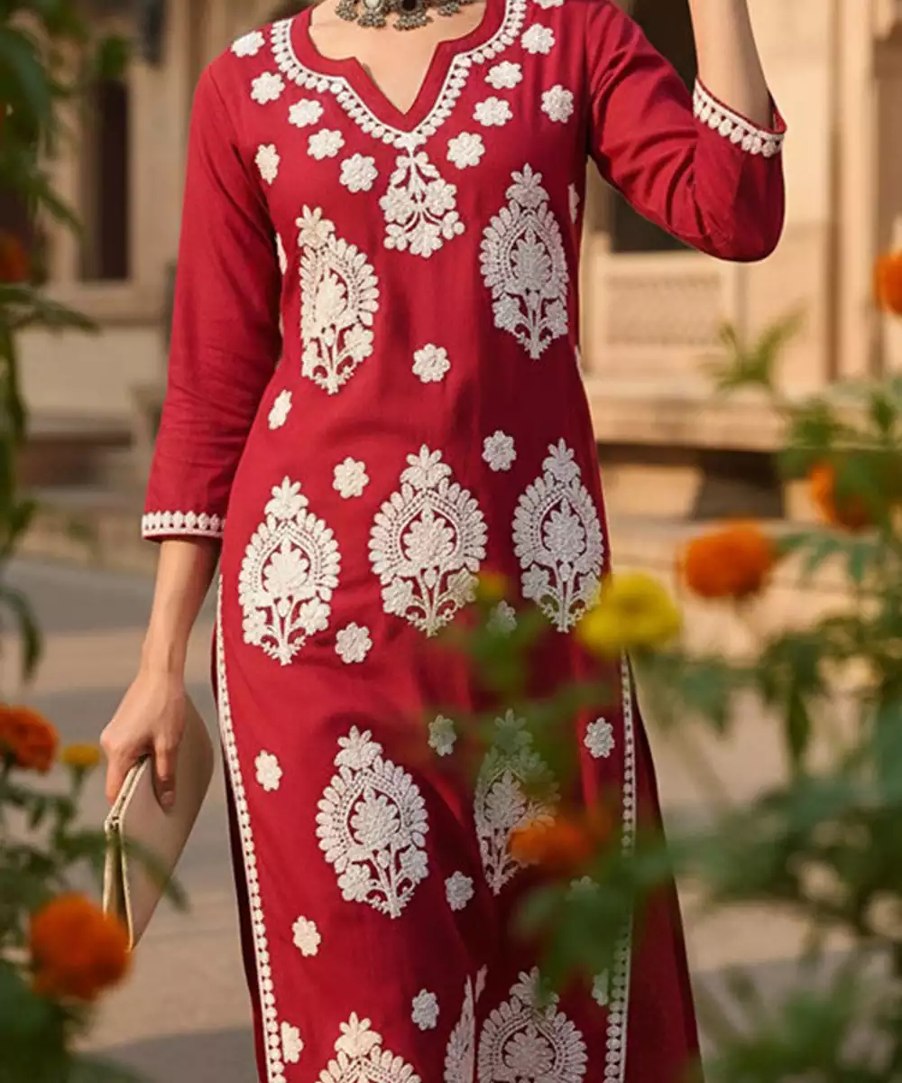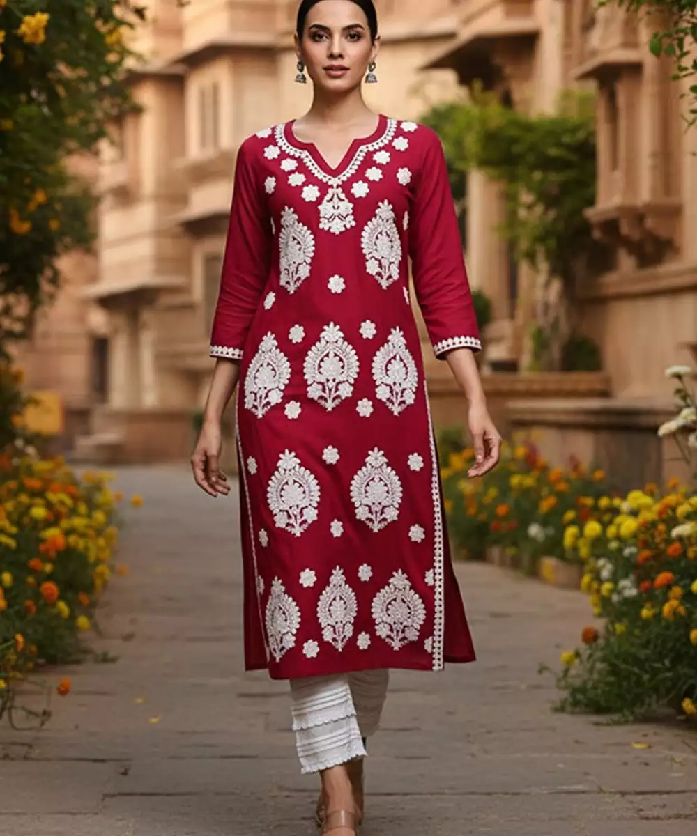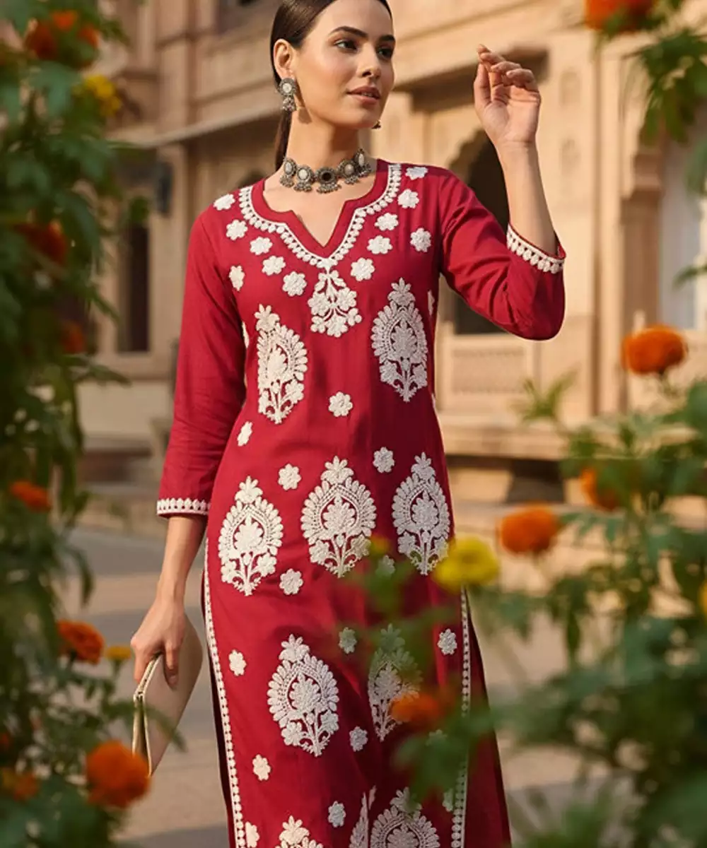 Round Neck Thread Work Straight Kurta
