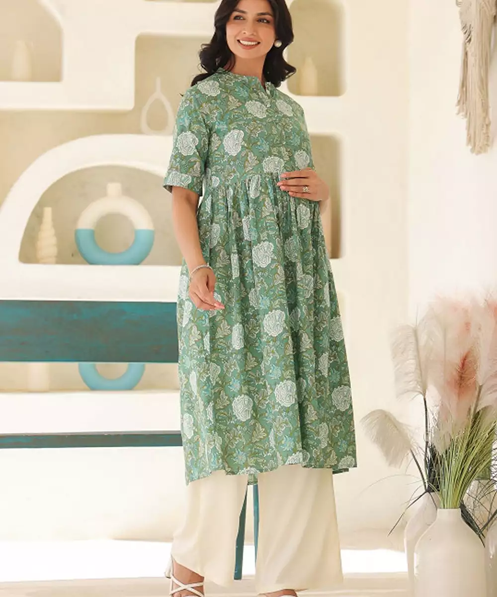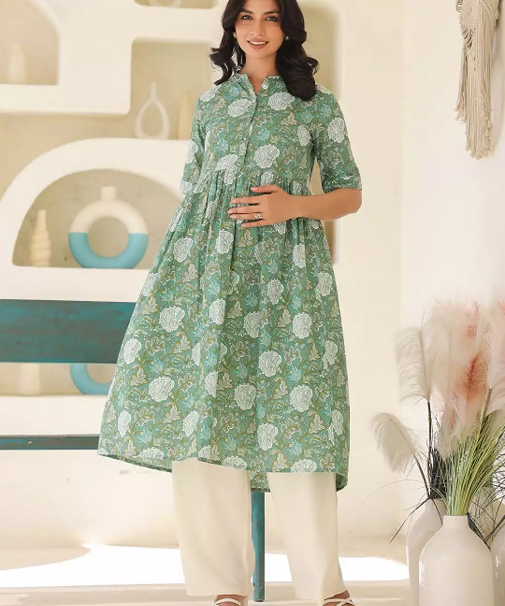 Sage Green Pure Cotton Floral Printed A Line Maternity Kurta