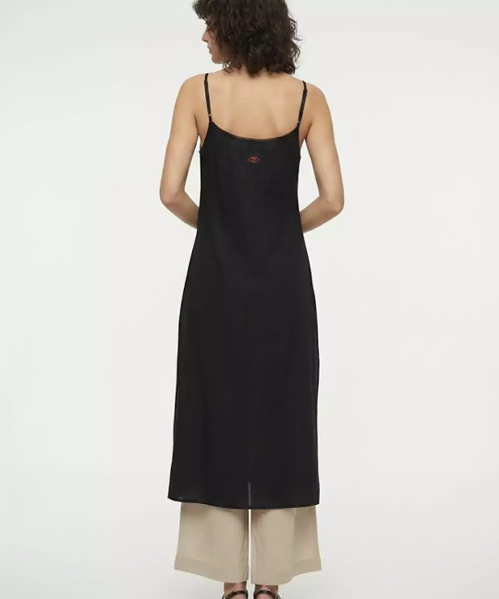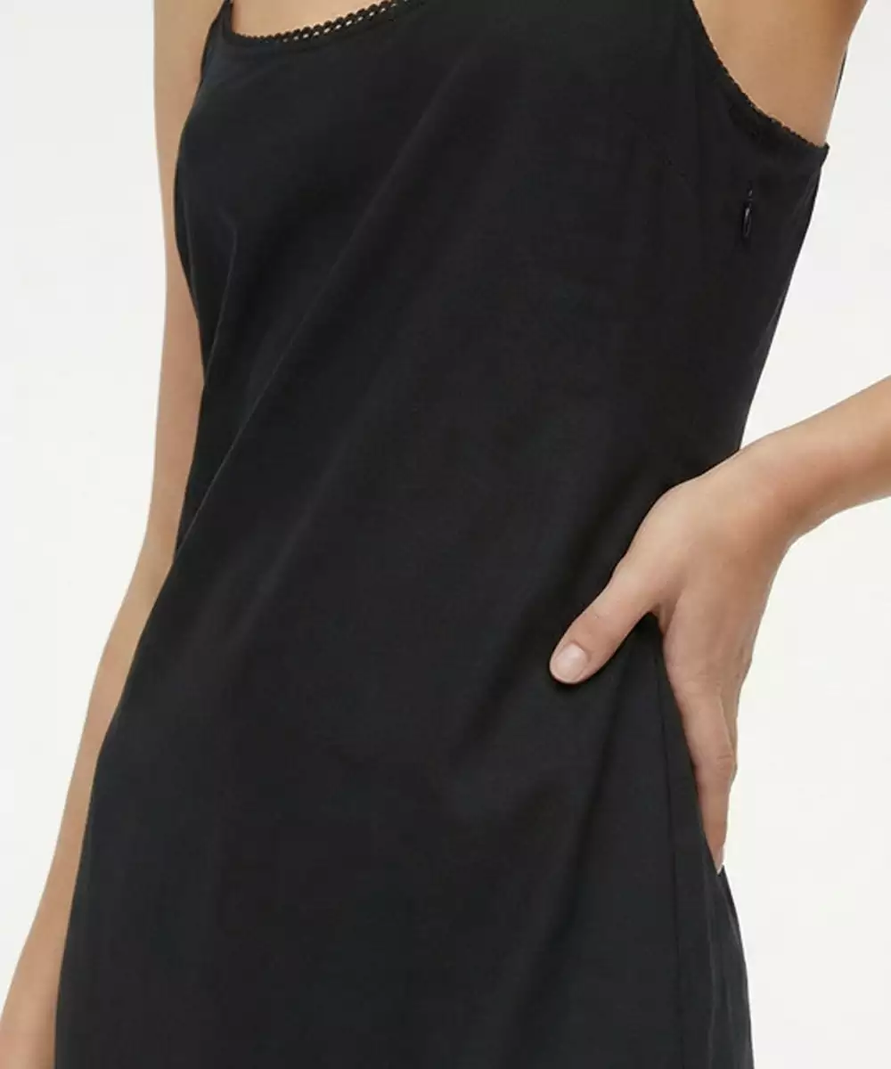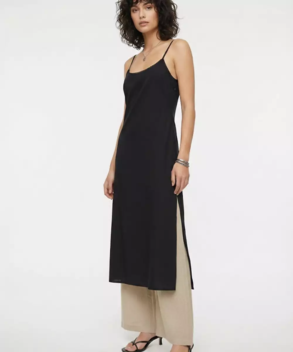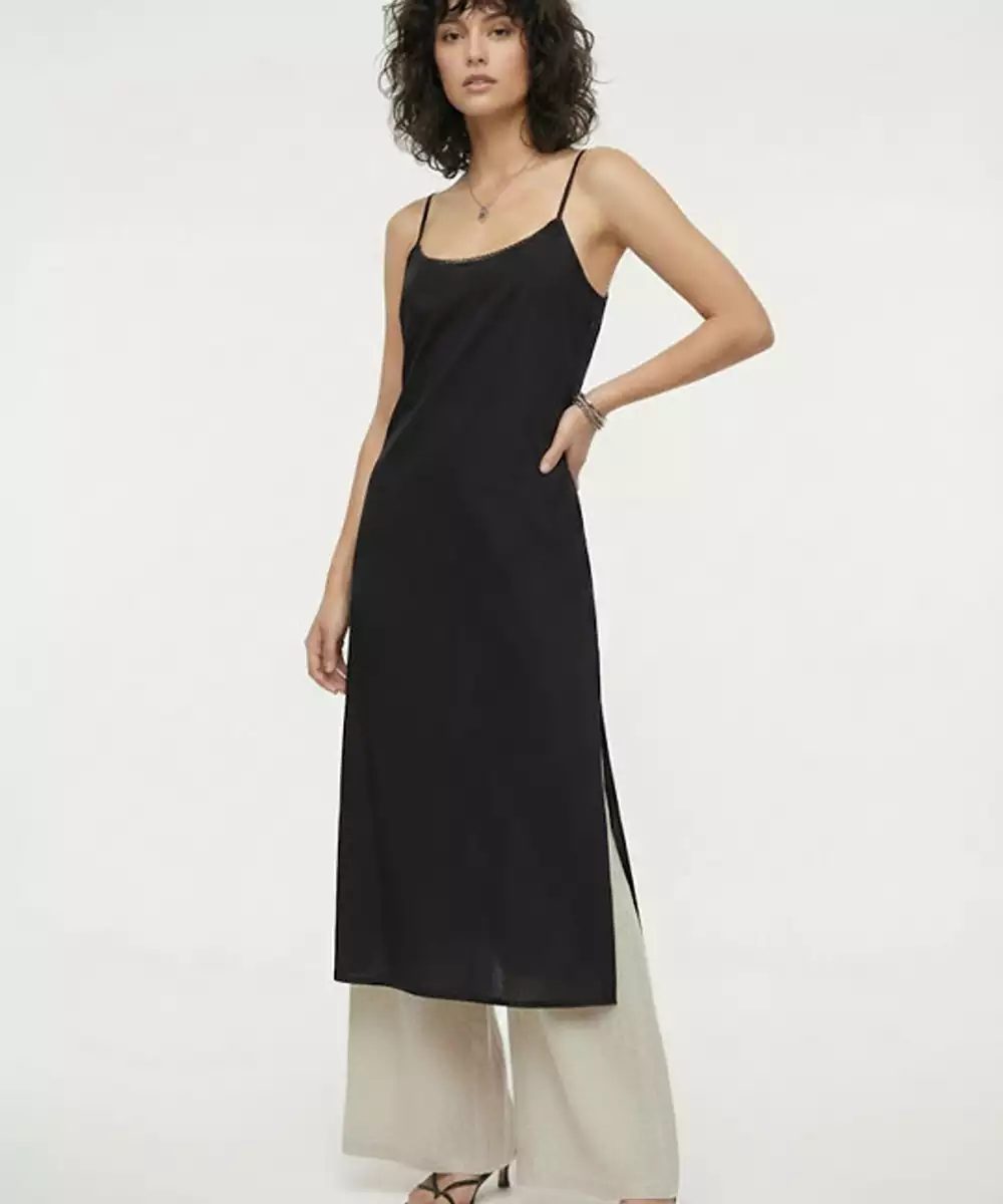 This Minimalist Black Kurta Is Defined By Its Clean, Straight Cut Silhouette And Delicate Shoulder Straps That Offer A Modern Twist On Traditional Wear. Crafted From Lightweight Fabric, The Side Slit Design Ensures Effortless Movement While Maintaining A Sharp, Elongated Profile. Color: Black Neckline: Shoulder Straps Sleeve Styling: Sleeveless, No Sleeves Length: Calf Disclaimer: The Model Is Ai Generated.