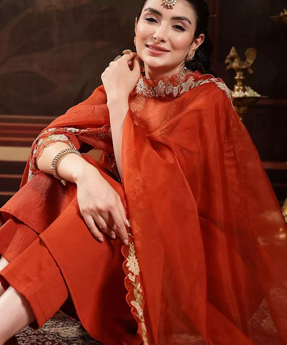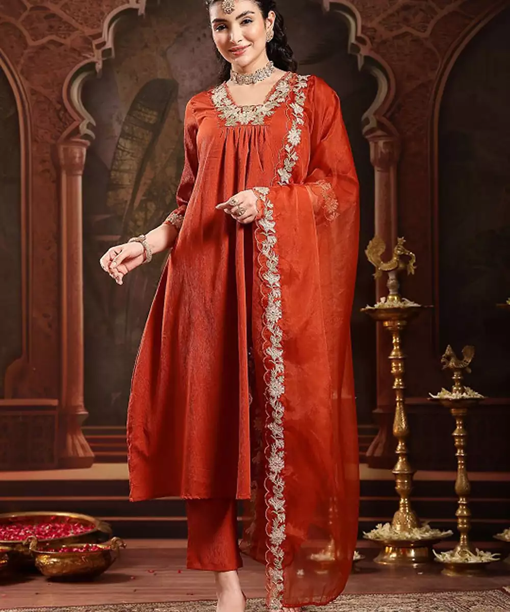 Rust & Gold Embroidered Kurta With Trousers & Dupatta Solid Embroidered Rust Kurta Anarkali Shape Square Neck Three Quarter Sleeves Slip On Closure