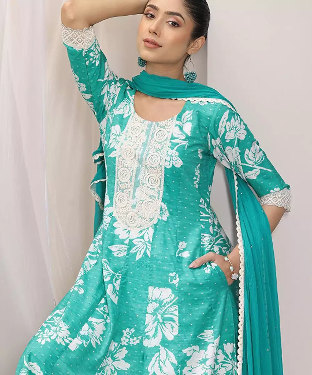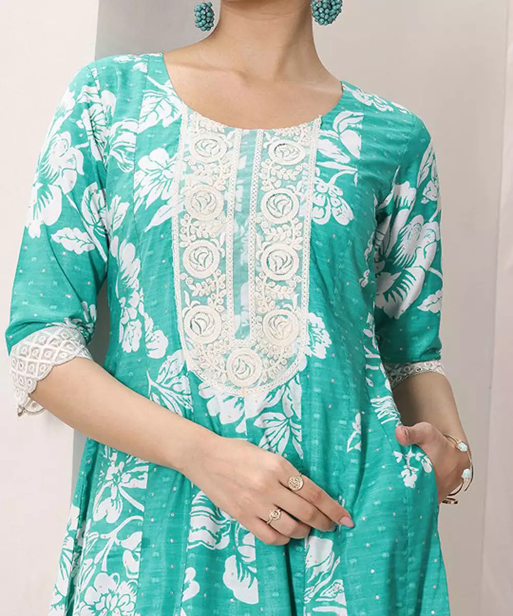 Green & White Printed Kurta With Trousers Floral Printed Green Kurta Anarkali Shape Round Neck Three Quarter Sleeves Slip On Closure