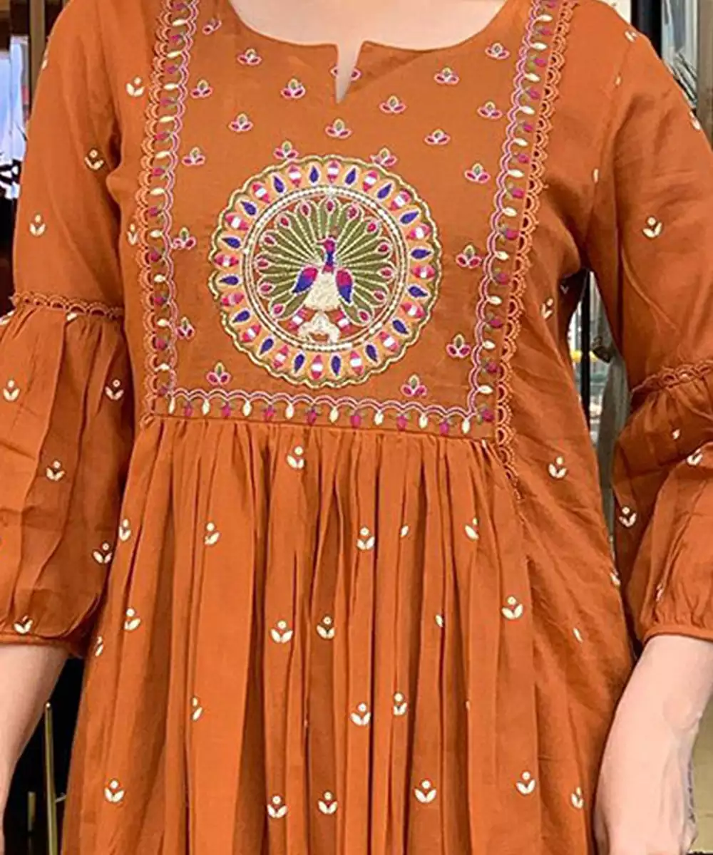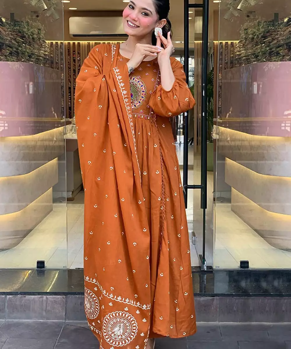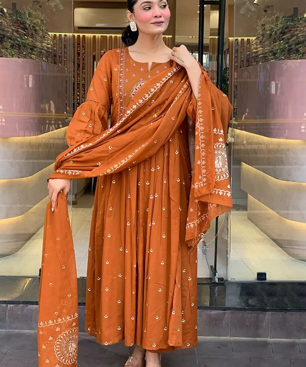 Rust & White Embroidered Kurta With Trousers & Dupatta Woven Design Embroidered Rust Kurta Anarkali Shape Round Neck Three Quarter Sleeves Slip On Closure