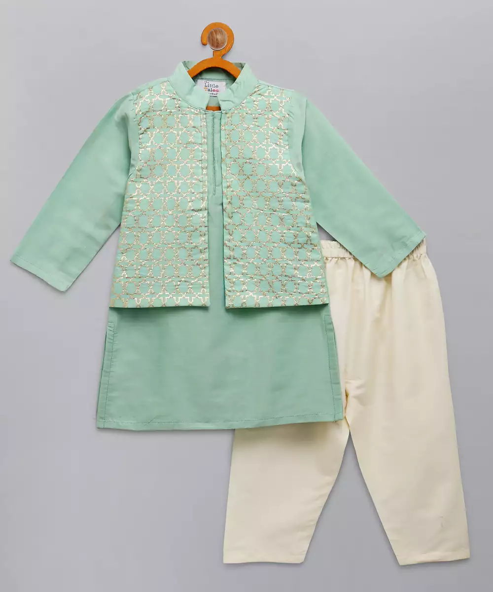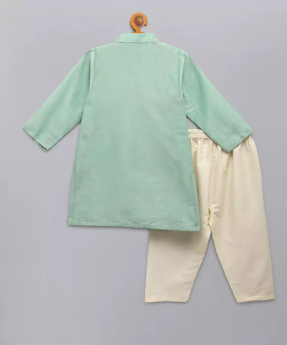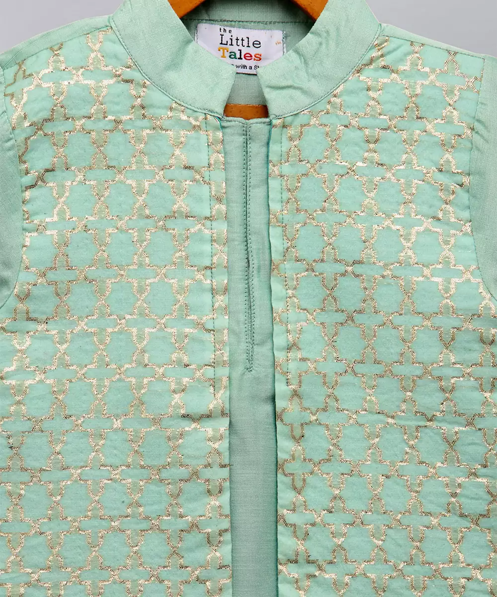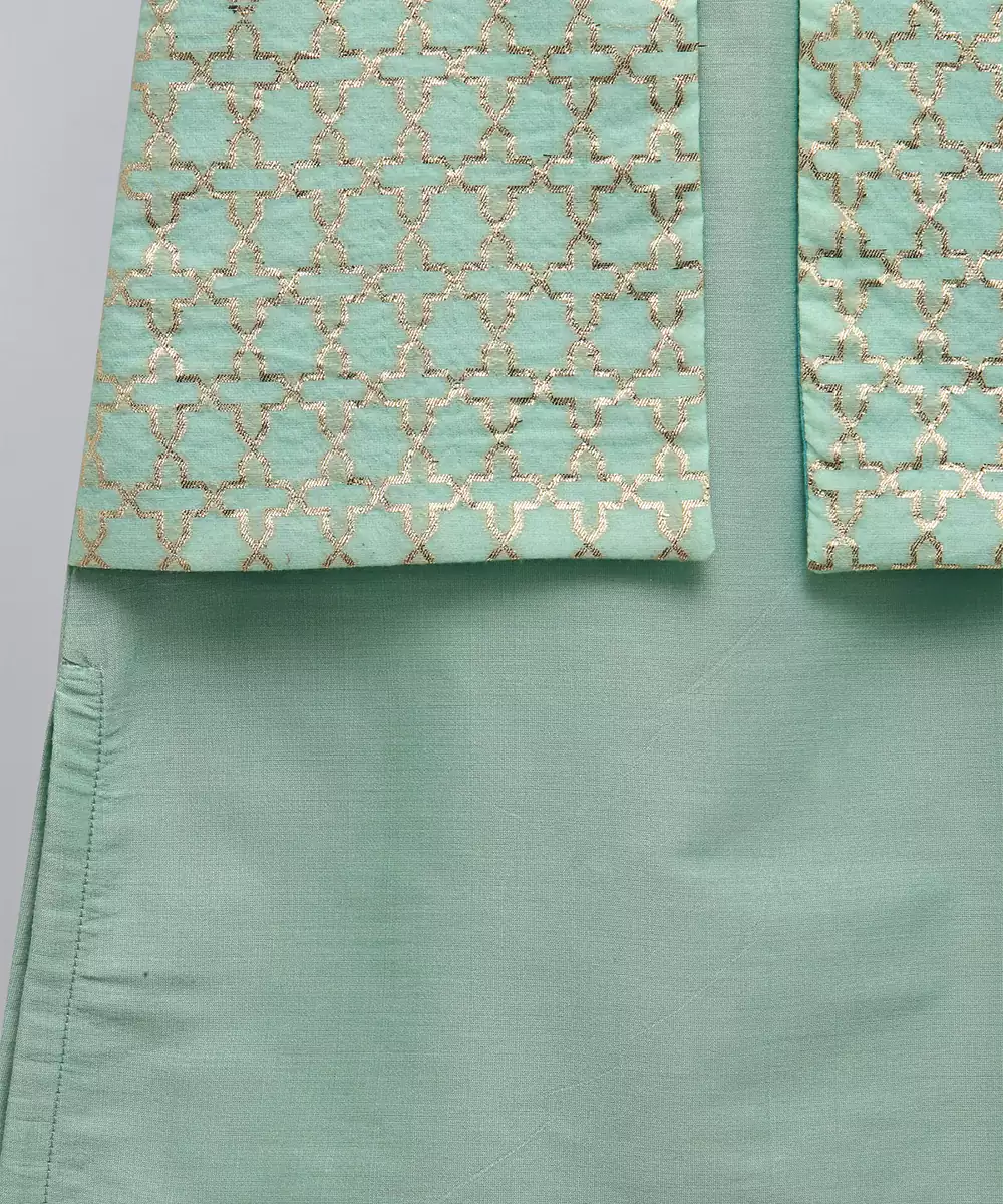 Pastel Green Kurta With Zari Attached Jacket On Both Sides. Kurta With Front Opening .Offwhite Cotton Silk Pyjama . Bottom With Elasticated Waist