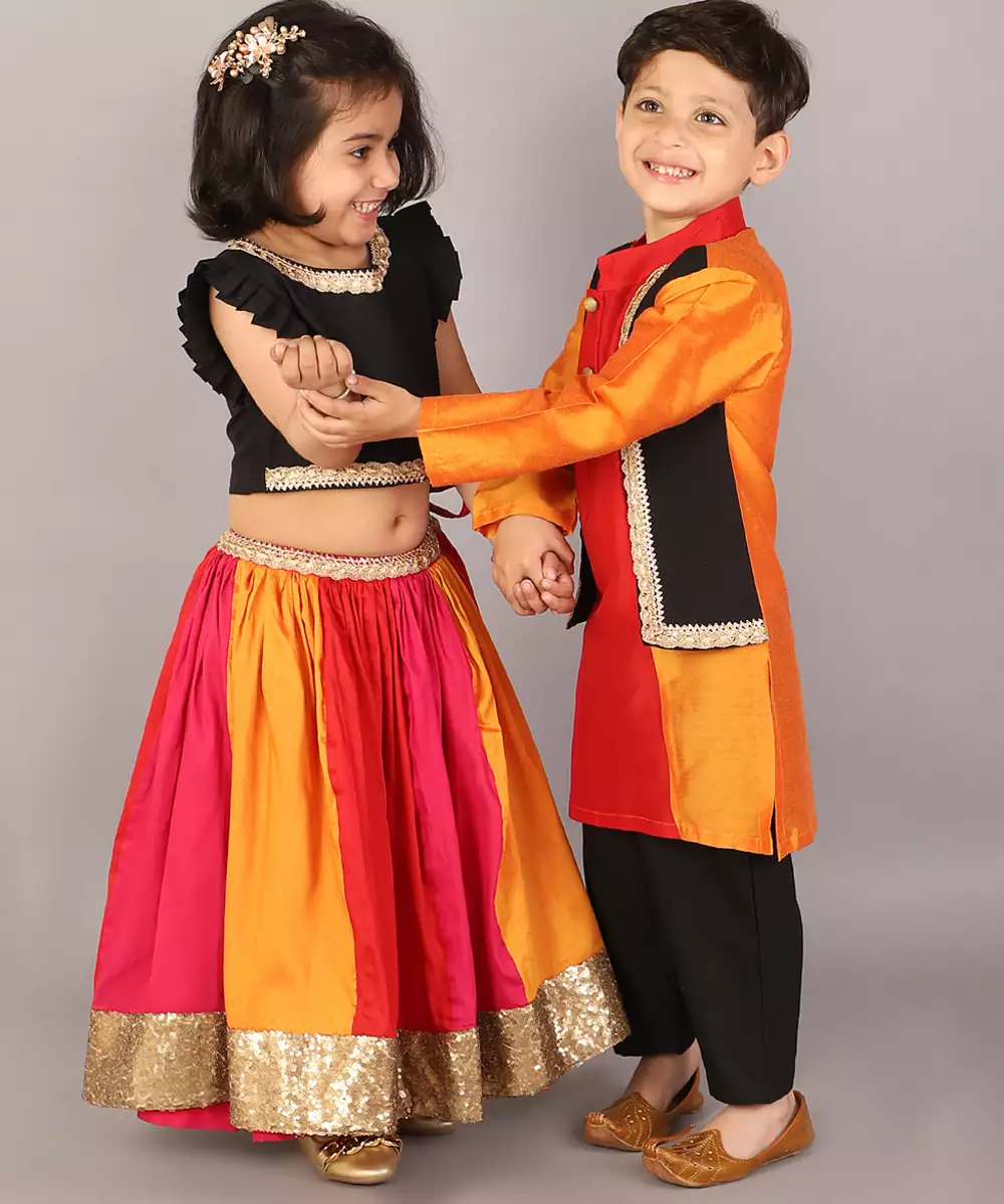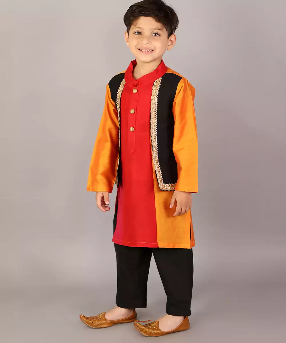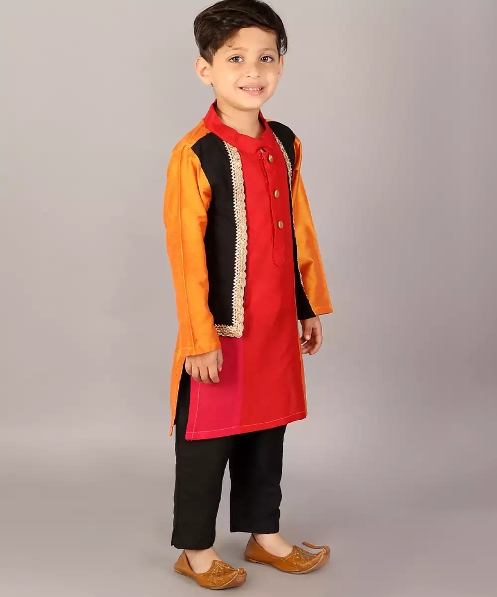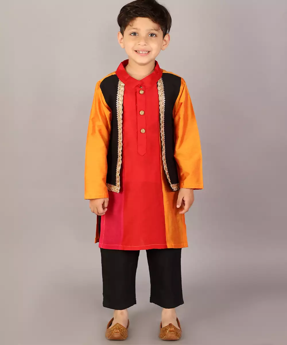 Multi Colored Kurta .Attached Black Jacket With Lace Embellishment . Bottom With Elastic