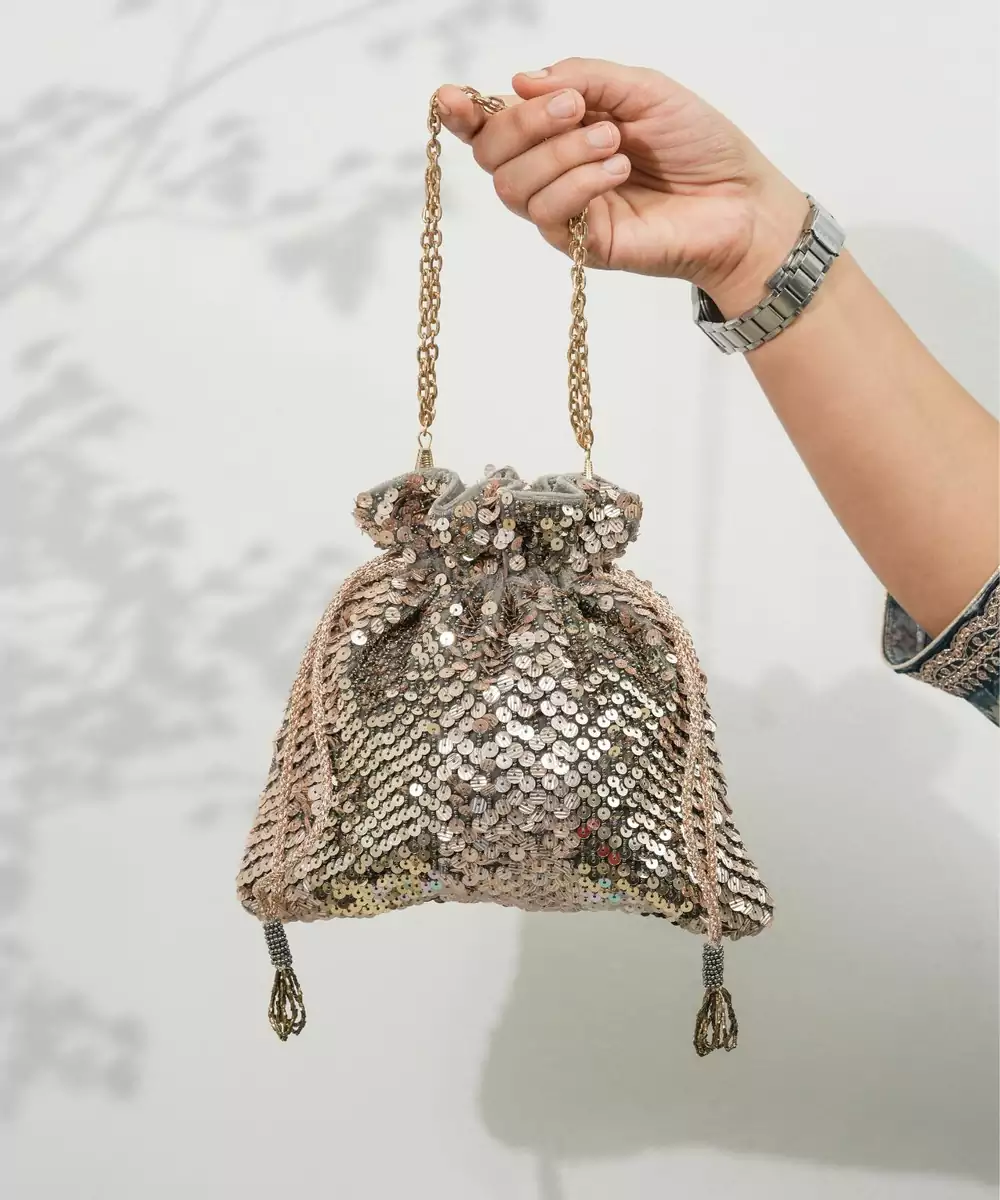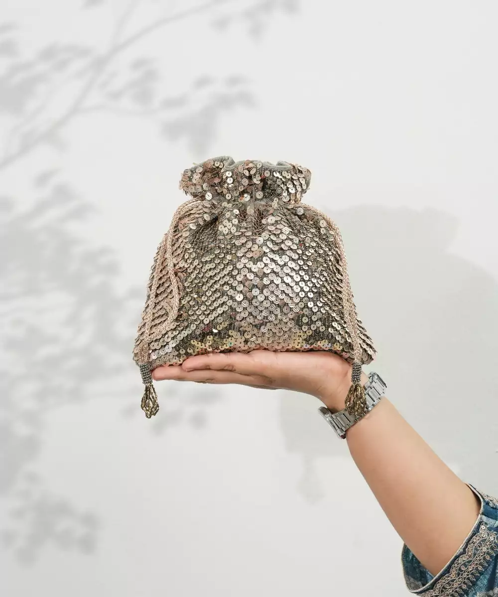 This Grey Velvet Sequin Embroidered Potli Bag Is A Statement Accessory For Festive And Wedding Occasions. Crafted In Soft Velvet, It Is Beautifully Embellished With Shimmering Sequins That Add Sparkle And Elegance. Lightweight Yet Roomy, It Features A Drawstring Closure, Making It Both Stylish And Functional For Carrying Essentials.
