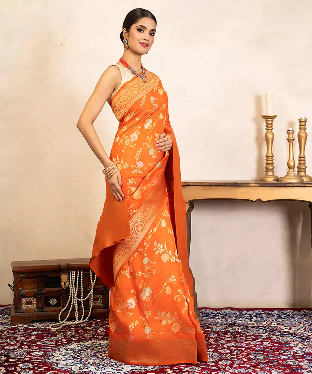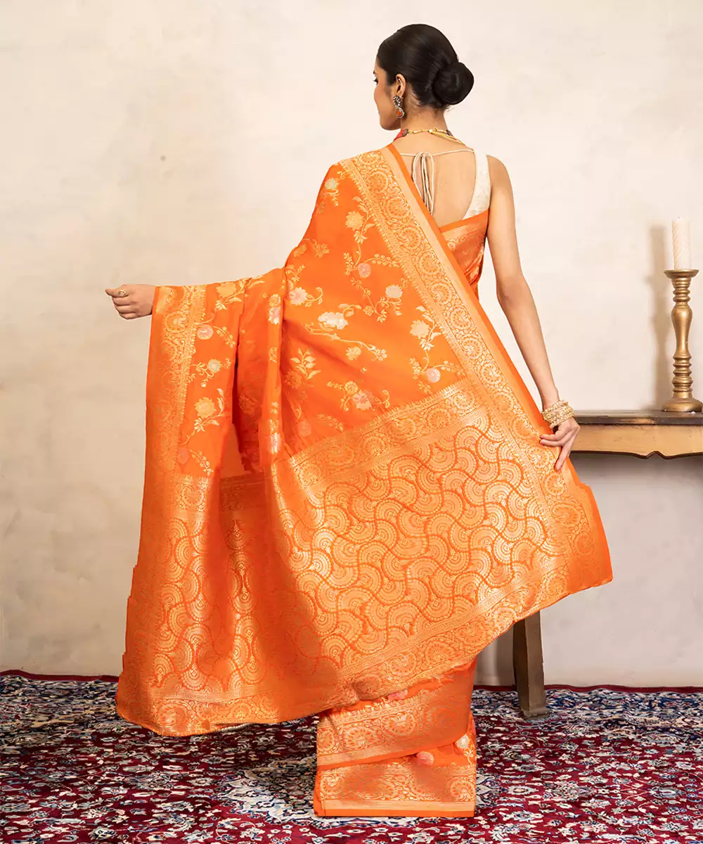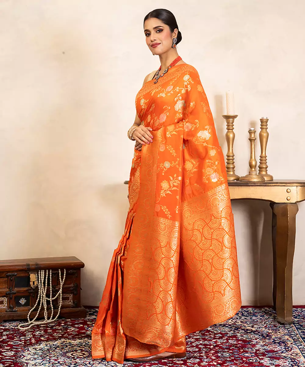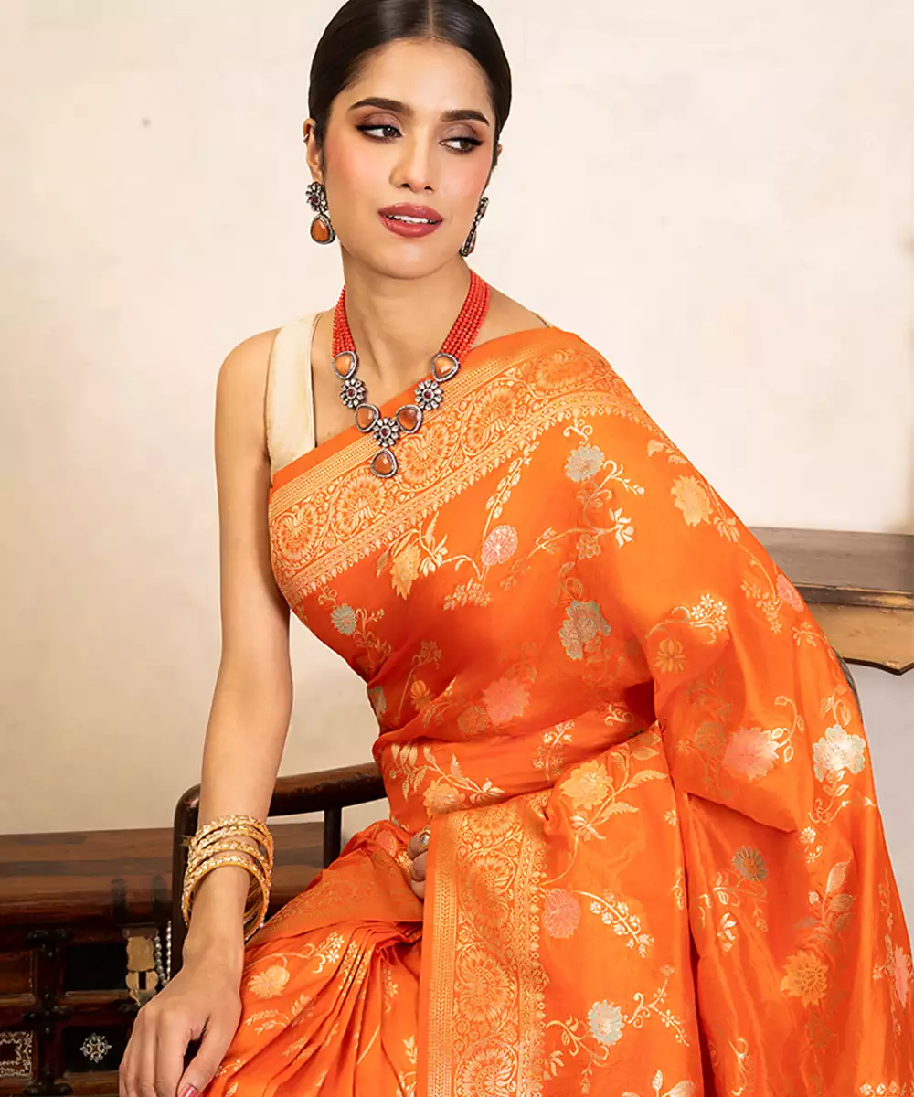 This Orange Banarasi Silk Saree Showcases Vibrant Charm With Intricate Handwoven Motifs. Its Rich Texture And Elegant Drape Make It Ideal For Festive Celebrations. Style It With Traditional Jewelry To Create A Bold, Radiant Look That Reflects Timeless Elegance And Cultural Heritage Beautifully.