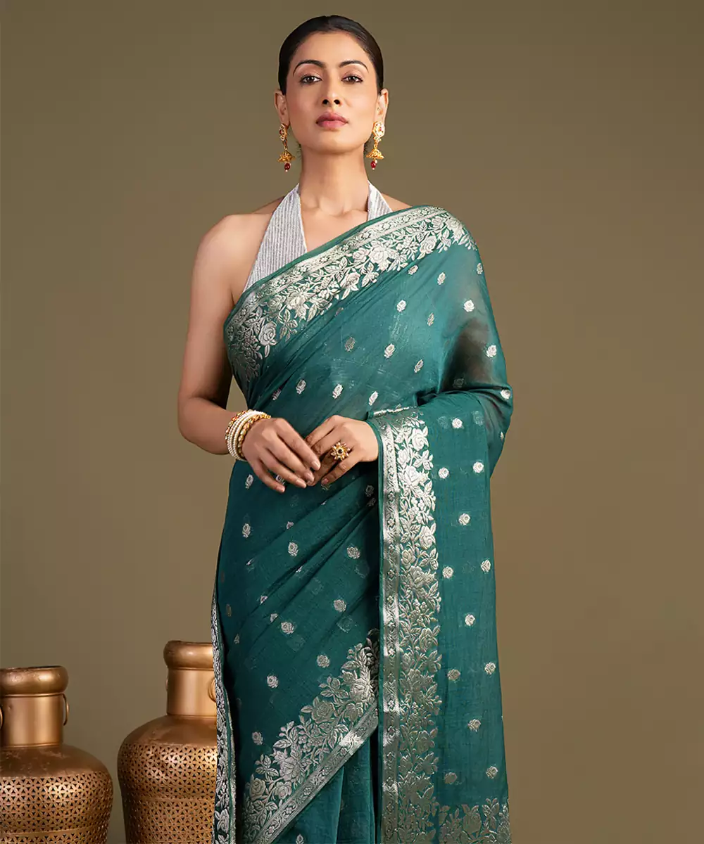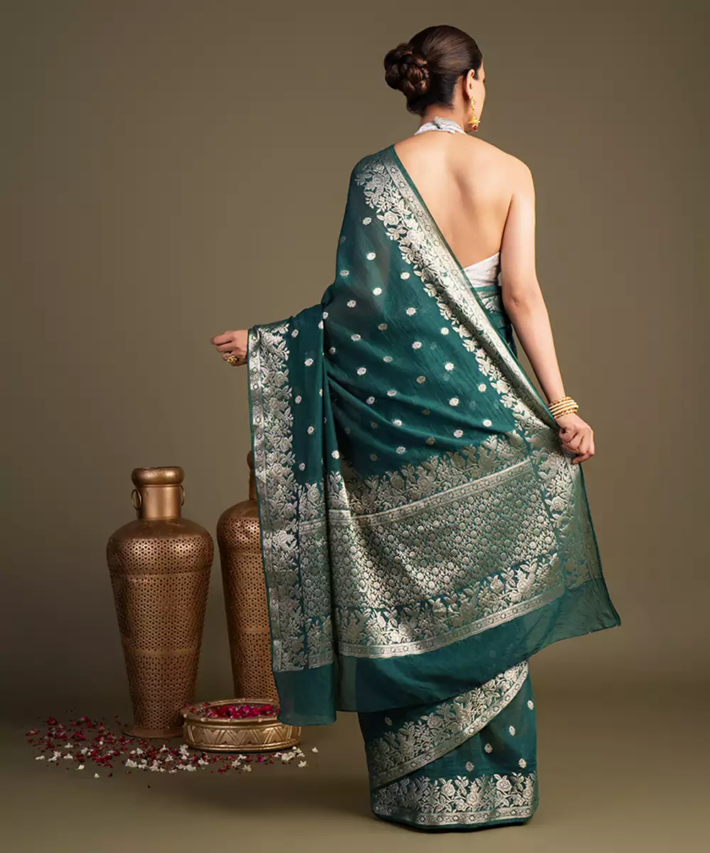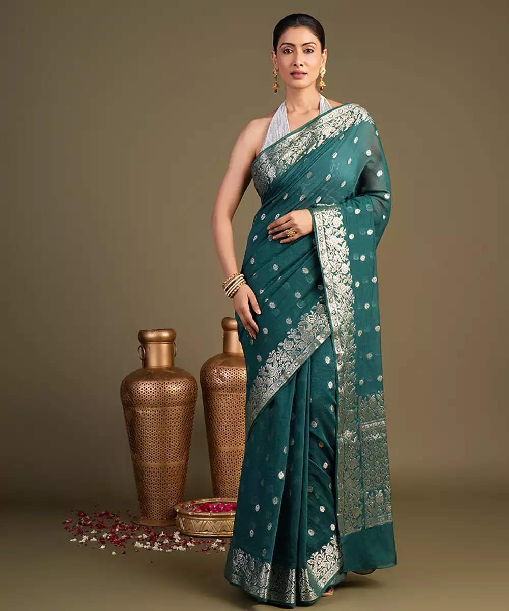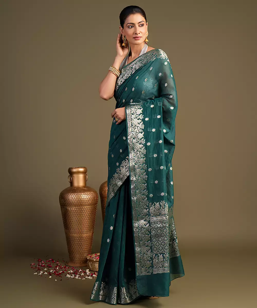 This Teal Blue Pure Silk Saree Features A Rich Texture And Fluid Drape, Crafted Using Traditional Handloom Techniques. Its Unique Hue Adds Depth And Elegance, Making It Perfect For Festive Occasions. Pair It With Statement Jewelry For A Bold Yet Refined Look.