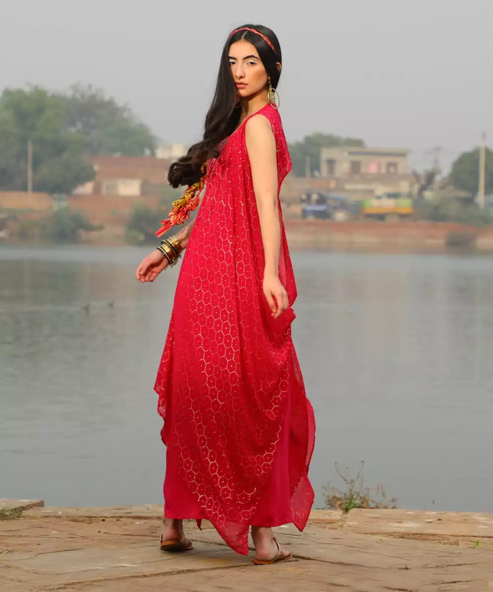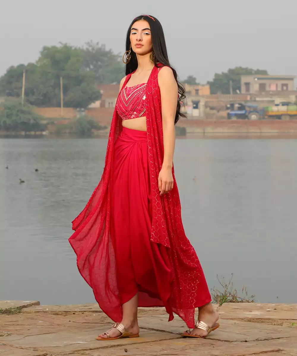 Bralet Embellished With Dense Mirror And Thread Embroidery, Paired With A Draped Skirt & A Bias Knot Shimmer Jacket. Also Available In Neon Yellow, Champagne, And Any Color Combination From The Whole Collection. Fabric: Shimmer Georgette & Muslin Modal,