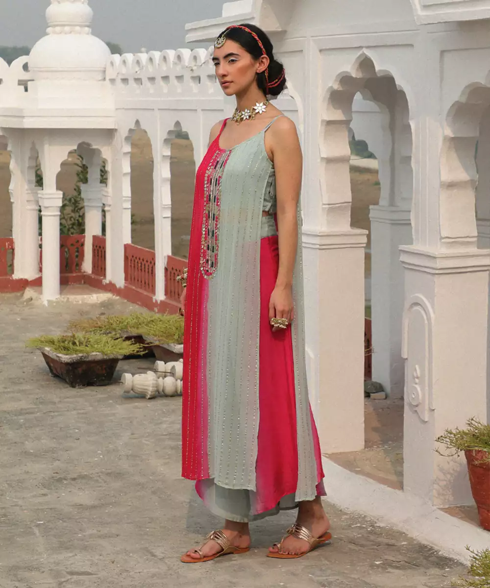 Half & Half Dyed (Rani Pink & Powder Blue) Spaghetti Tunic With A Long Slit, Embellished With Dense Mirror And Thread Embroidery, Paired With Asymmetric Pants. Also Available In A Sea Green/Dark Green, Champagne/Neon, Mouse Pink/Dark Pink, And Any Color Combination From The Whole Collection. Fabric: Shimmer Georgette & Muslin Modal, Care: Dry Clean Only .