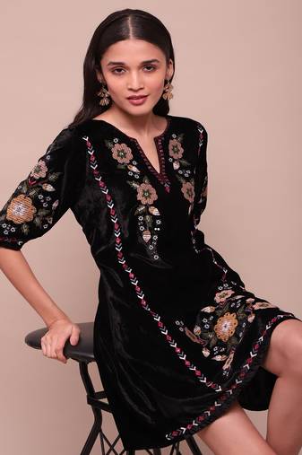 Little Black Dress With Plunging V Neckline Hand Embroidered With Gold And Blue Cutdana, Crystals, Micro Tube Beads And Sequins. Back Zip Closure Length 32 Inches Model Wears Size Xs Dry Clean Only