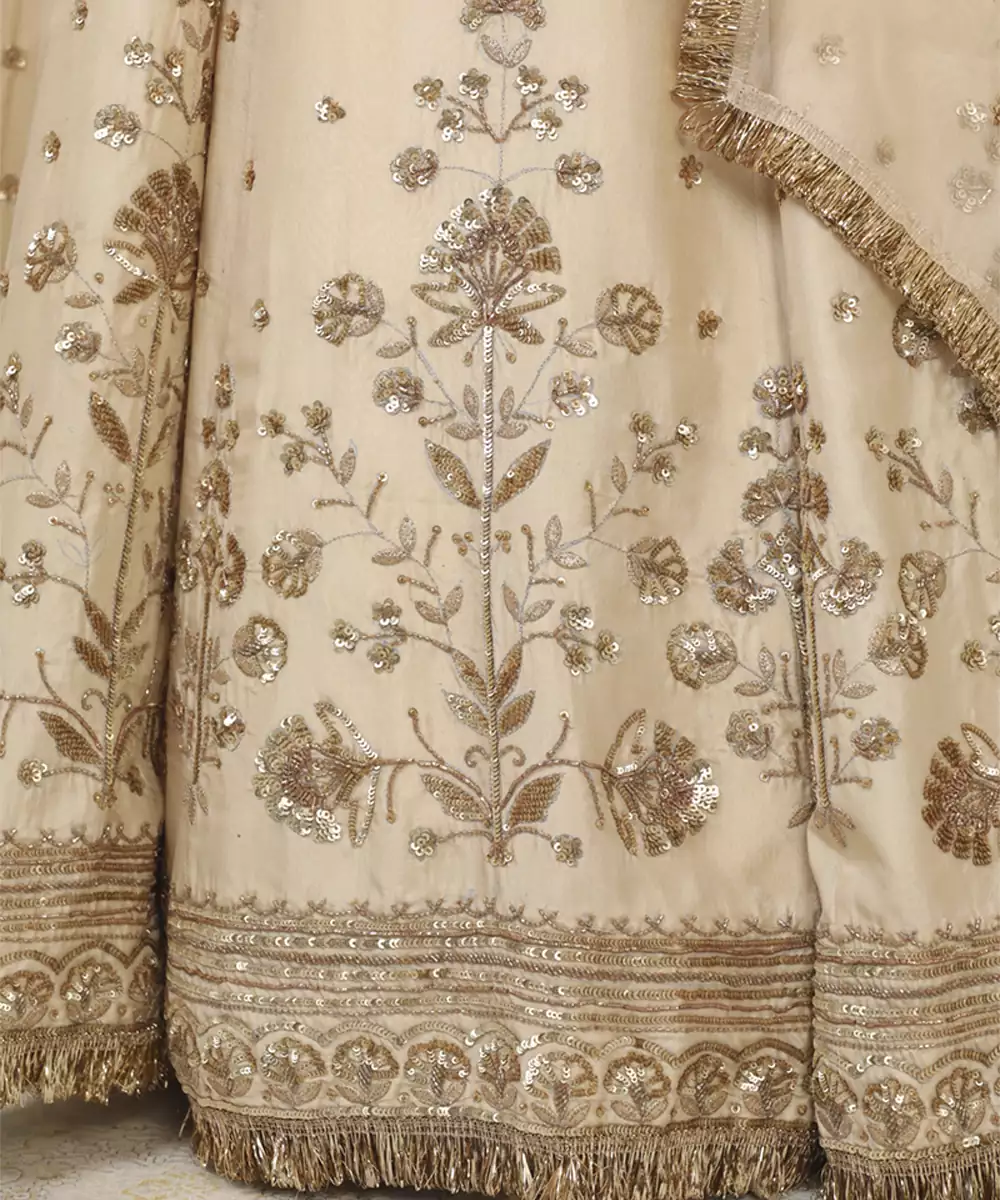 Featuring A Cream Lehenga In Pure Silk Base With Gota Patti,Dabka Nakshi Sequence And Cutdana Embellishment. It Is Paired With Handwork Blouse And An Organza Dupatta.