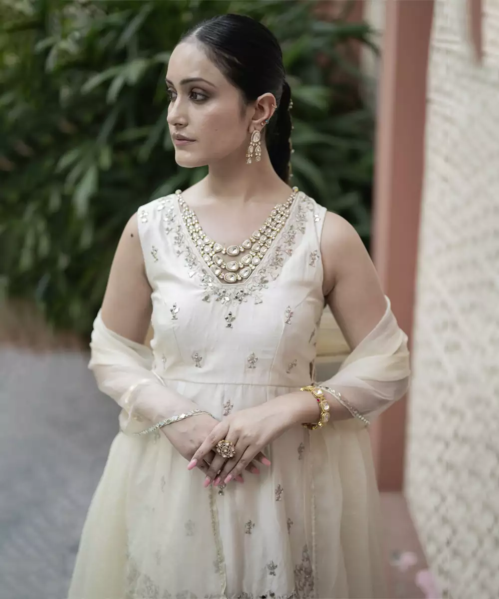 Featuring An Off White Mirror Embroidered Kurta Paired With Chanderi Lehenga And Dupatta In Organza Base With Mirror Border .