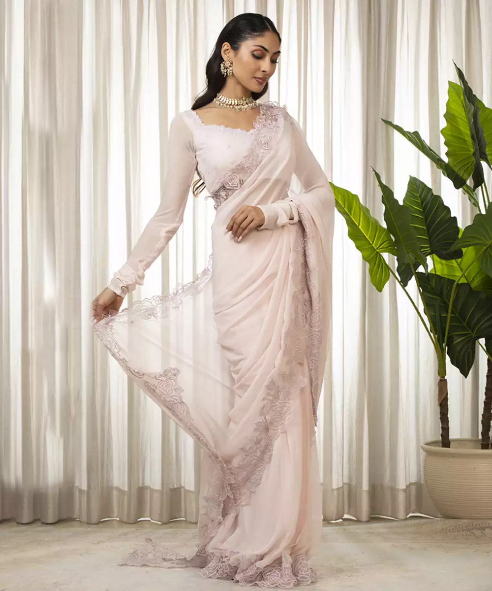 It Consists Georgette Saree With Detailed Organza Cutwork All Over Embellished With 3 D Cutwork And Handwork.It Is Paired With Georgette Blouse With Chudidaar Sleeves And Peticoat.