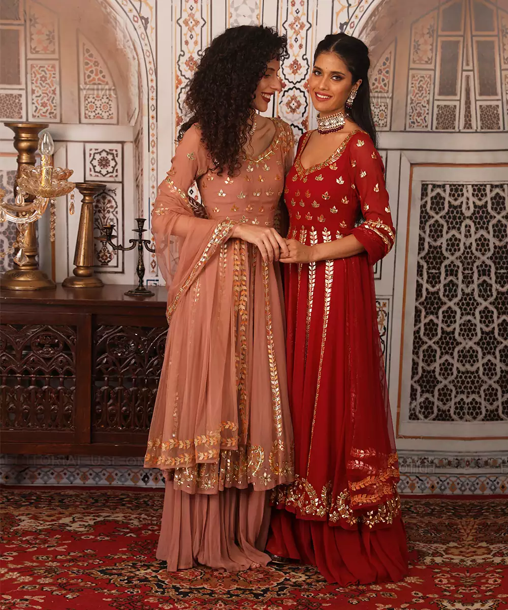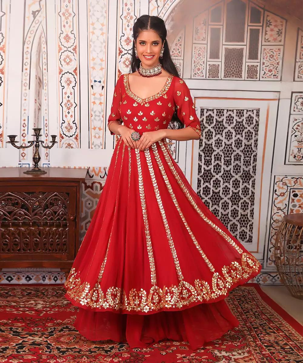 Featuring A Red Anarkali In Georgette Base Embellished With Gota , And Sequence . It Is Paired With A Matching Plazzo And Net Dupatta With Gota Border.