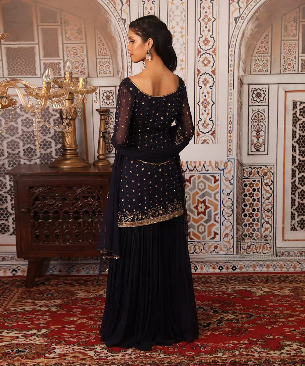 Featuring A Navy Blue Kurta In Georgette Base Embellished With Sequence . It Is Paired With A Matching Sharara And Net Dupatta With Sequence Border .