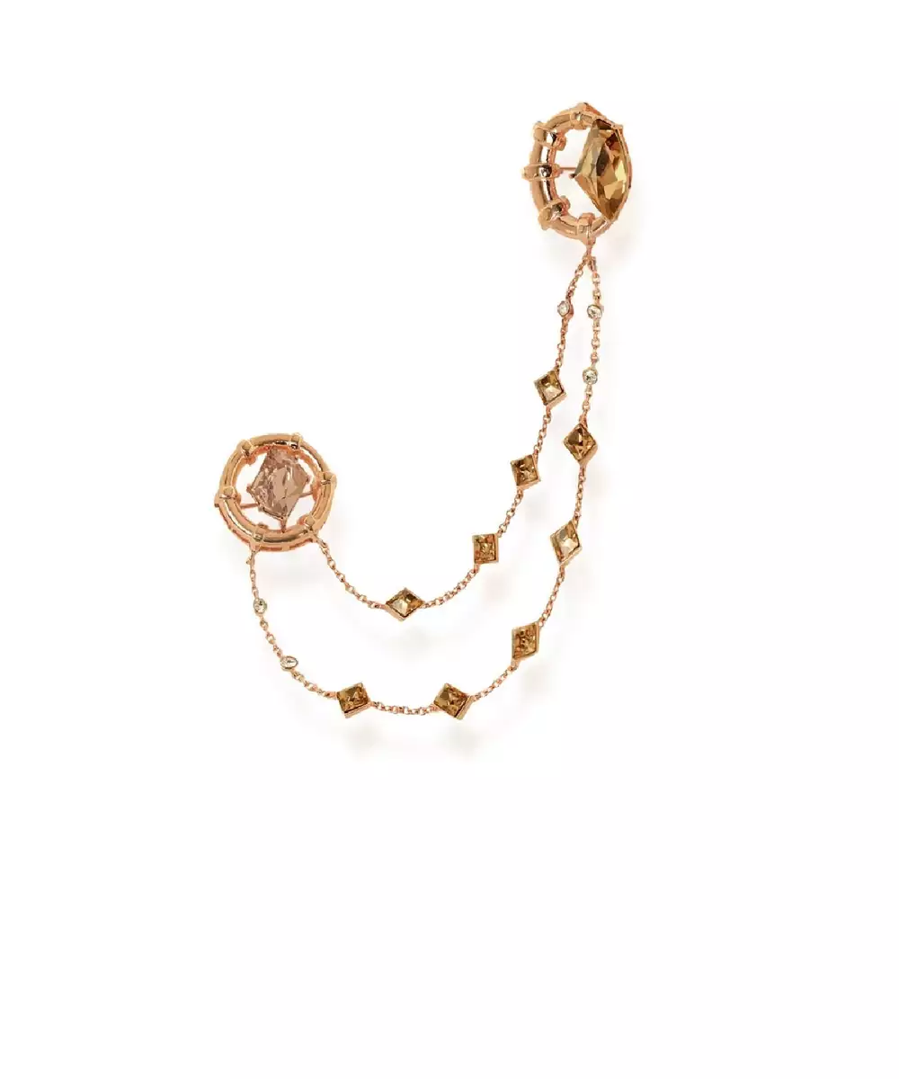 Unisex Brooch Studded With Gold And Light Pink Designer Cut Swarovski Crystals And Smoky Quartz Squares Short Length