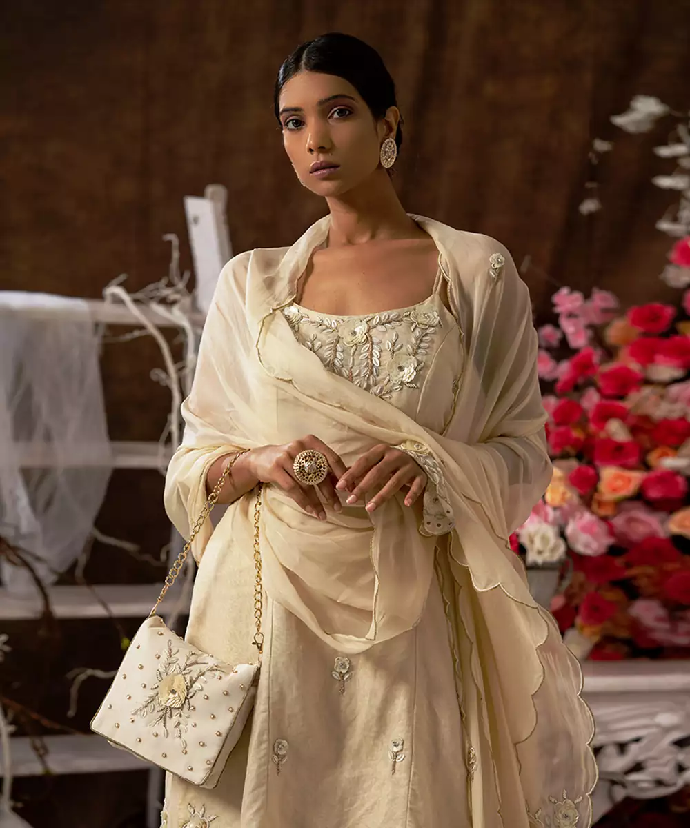 Colour Ivory Champagne, Material For Kurta Chanderi Soft Tissue For Double Layer Sharara Its Chanderi Soft Tissue And Soft Organza And Fordupatta Soft Organzahand Embroidery Mix Of Pearls Sequins Zardozi Salma And Jarkan Cut Dana.