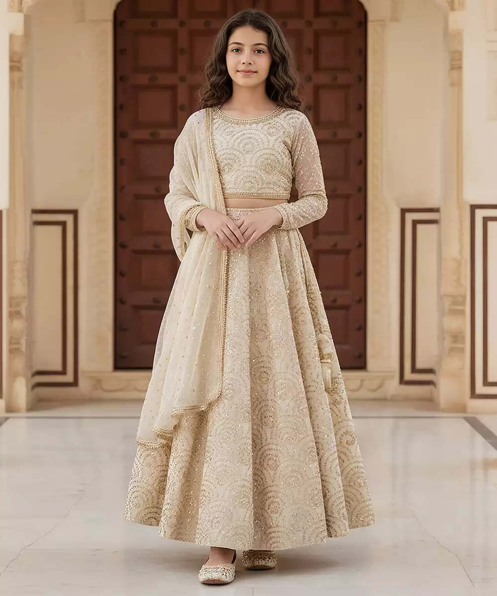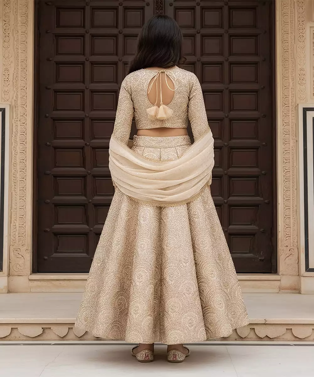Elegant And Refined, This Beige Embroidered Dupion Lehenga Set Blends Traditional Charm With Modern Style. Crafted From Rich Dupion Fabric, The Lehenga Features Delicate Embroidery, Paired With A Matching Blouse And Dupatta. Ideal For Weddings, Receptions, Or Festive Occasions, This Set Offers Sophistication, Comfort, And A Graceful Silhouette.