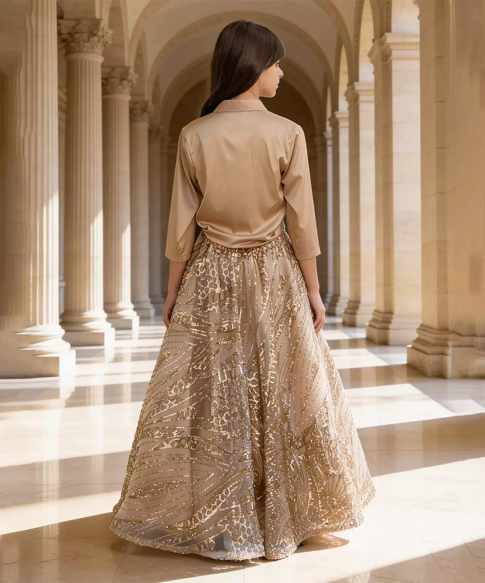 This Beige Satin Indo Western Lehenga Set Features Intricate Embroidery That Blends Tradition With Modern Style. The Smooth Fabric Offers A Subtle Sheen, While The Contemporary Silhouette Adds Elegance. Perfect For Festive Occasions, It Pairs Beautifully With Statement Accessories For A Chic And Refined Look.