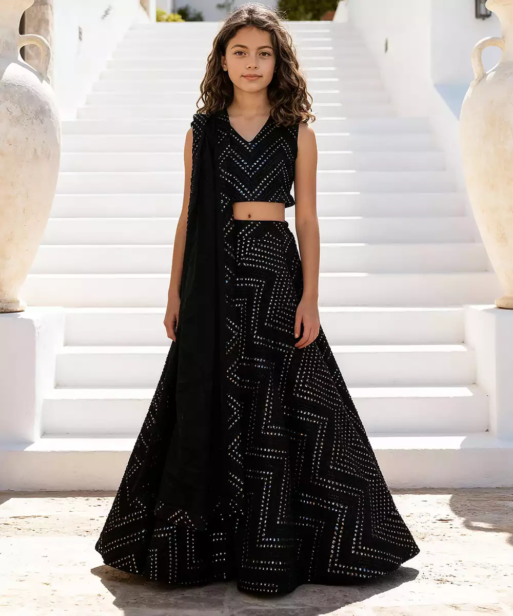 Make A Bold Statement With This Black Embroidered Georgette Lehenga Set. The Flowing Georgette Lehenga Is Enhanced With Intricate Embroidery, Paired With A Matching Blouse And Dupatta For A Complete Festive Ensemble. Perfect For Weddings Or Evening Celebrations, It Exudes Elegance, Sophistication, And Contemporary Charm With Traditional Flair.