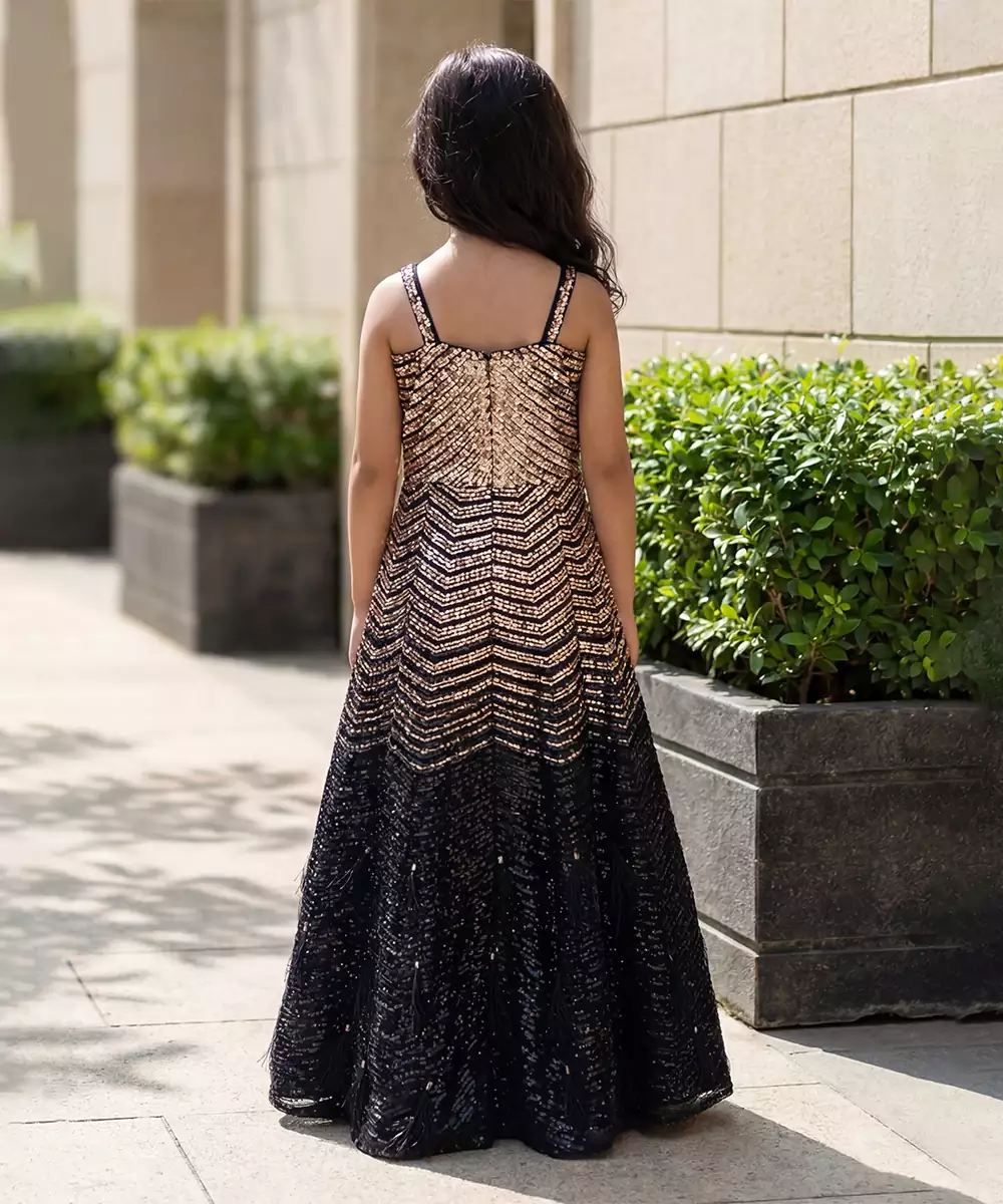 This Black Net Gown With Gold Embroidery Exudes Luxury And Elegance. The Intricate Detailing Adds Richness, While The Sheer Fabric Creates A Dramatic And Flowy Silhouette. Ideal For Evening Events, It Pairs Beautifully With Statement Accessories For A Bold And Glamorous Appearance.