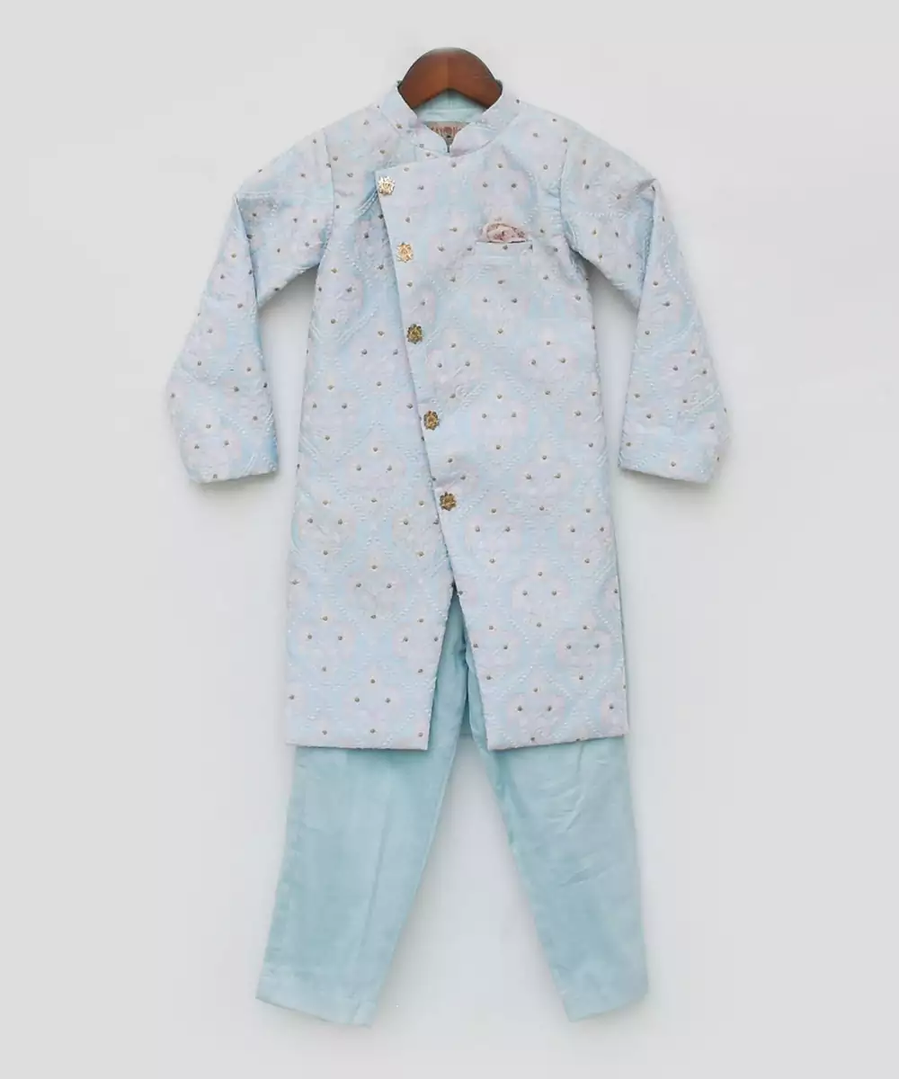 Get This Blue Embroidery Achkan And Pant Which Has A Pocket Square. Don't Miss Out On These Styles As We Can't Keep Calm But Wait To See The Little Hero's Dressed In Fayon.