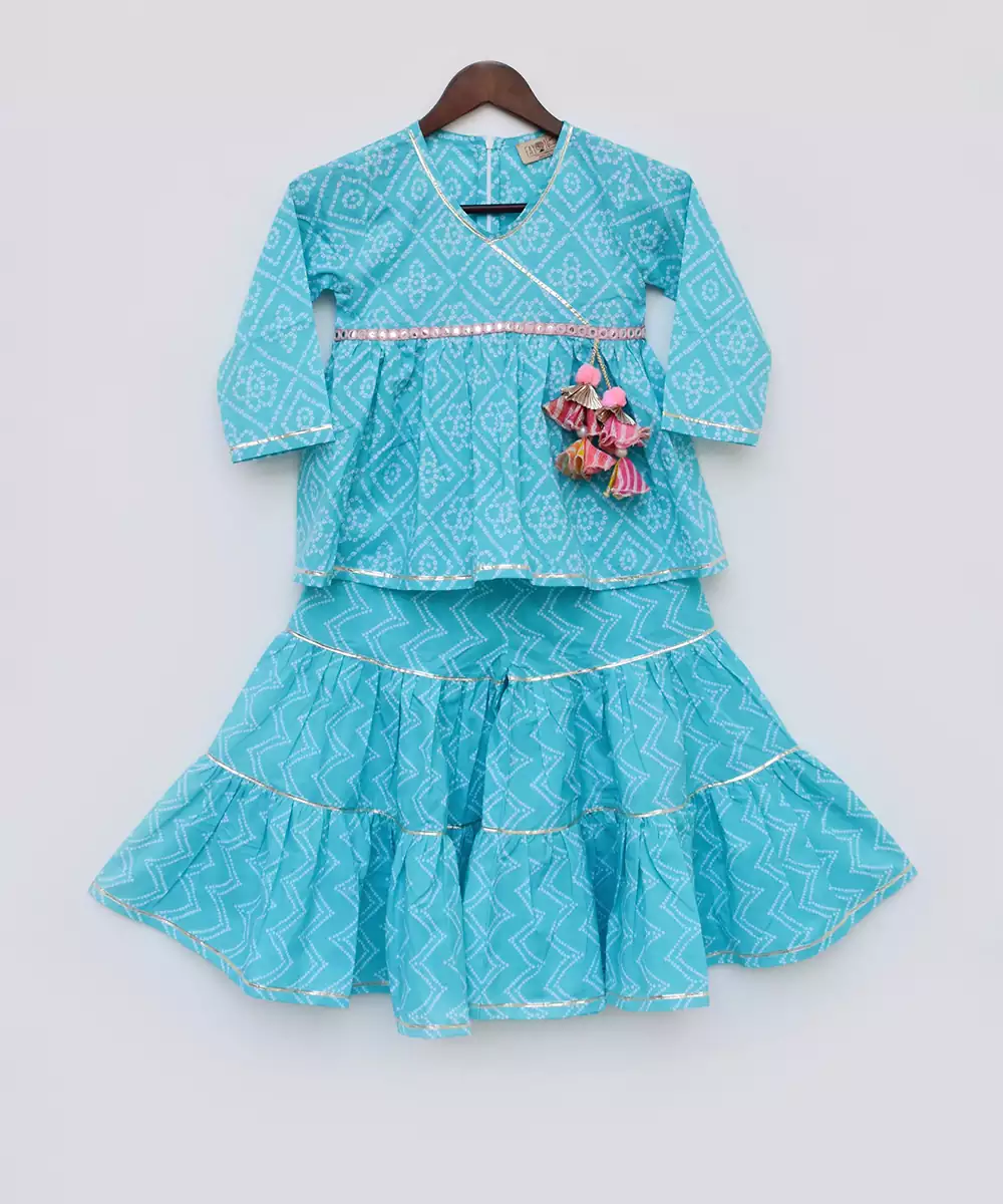 This Beautiful Sharara Set Comes With Printed Cotton Kurti And Sharara In Fresh Turquoise Hues. It Has Hand Made Tassels To Add An Edge To The Outfit. It Is A Summer Perfect Outfit To Adorn Your Little Girl In.Printed Kurti Without Liningv Neck And Zip At Back3/4 Sleevessilver And Pink Mirror.