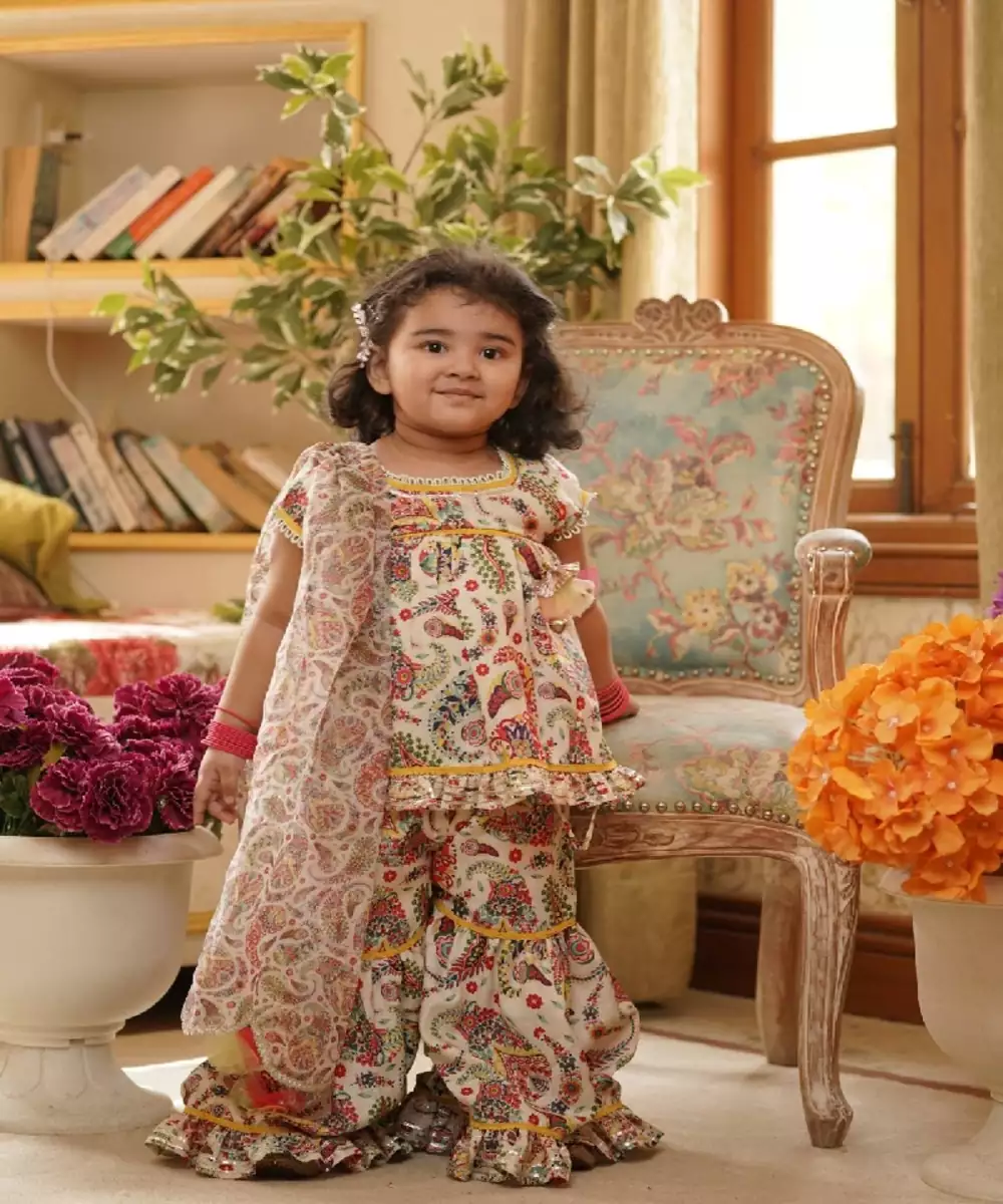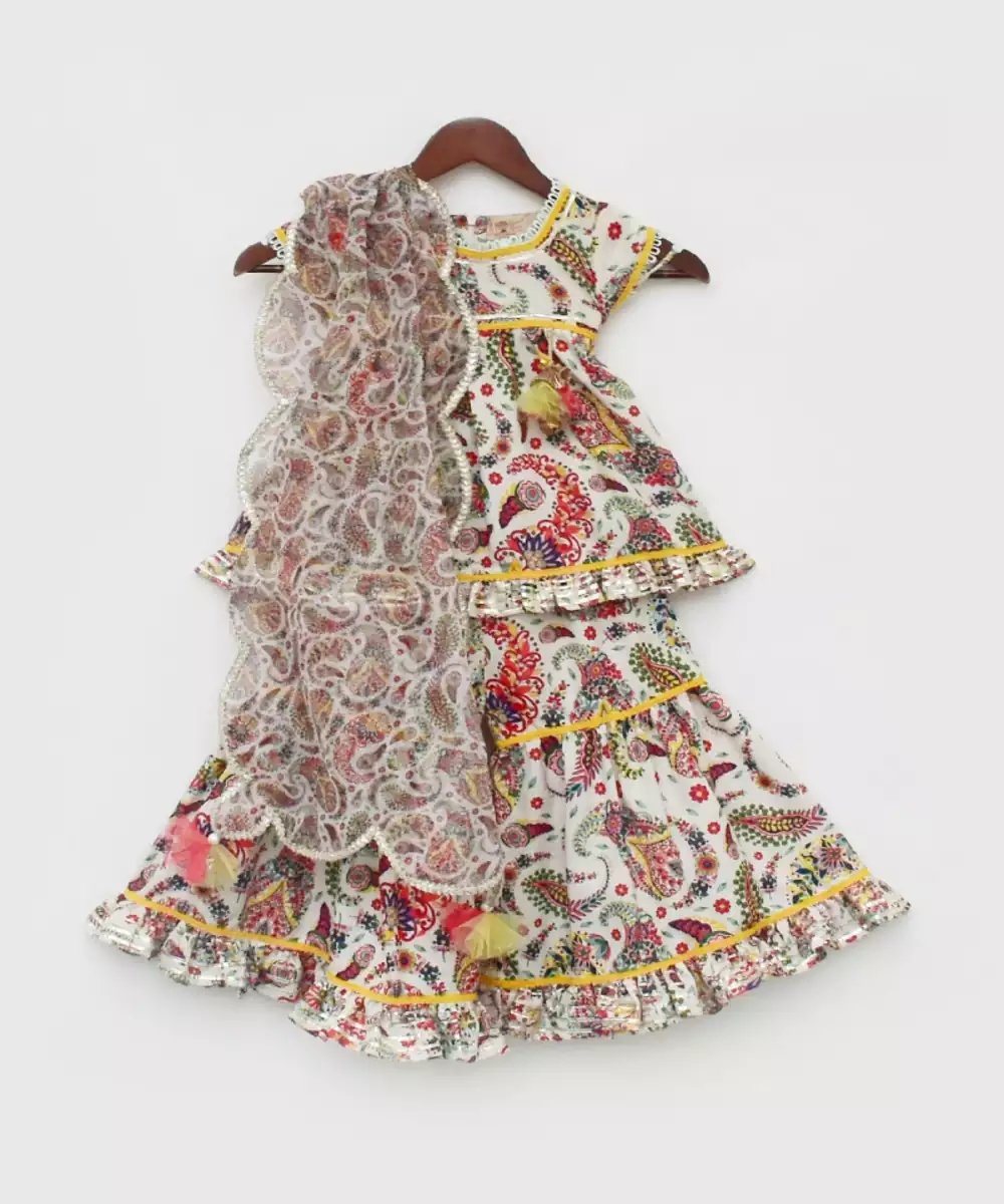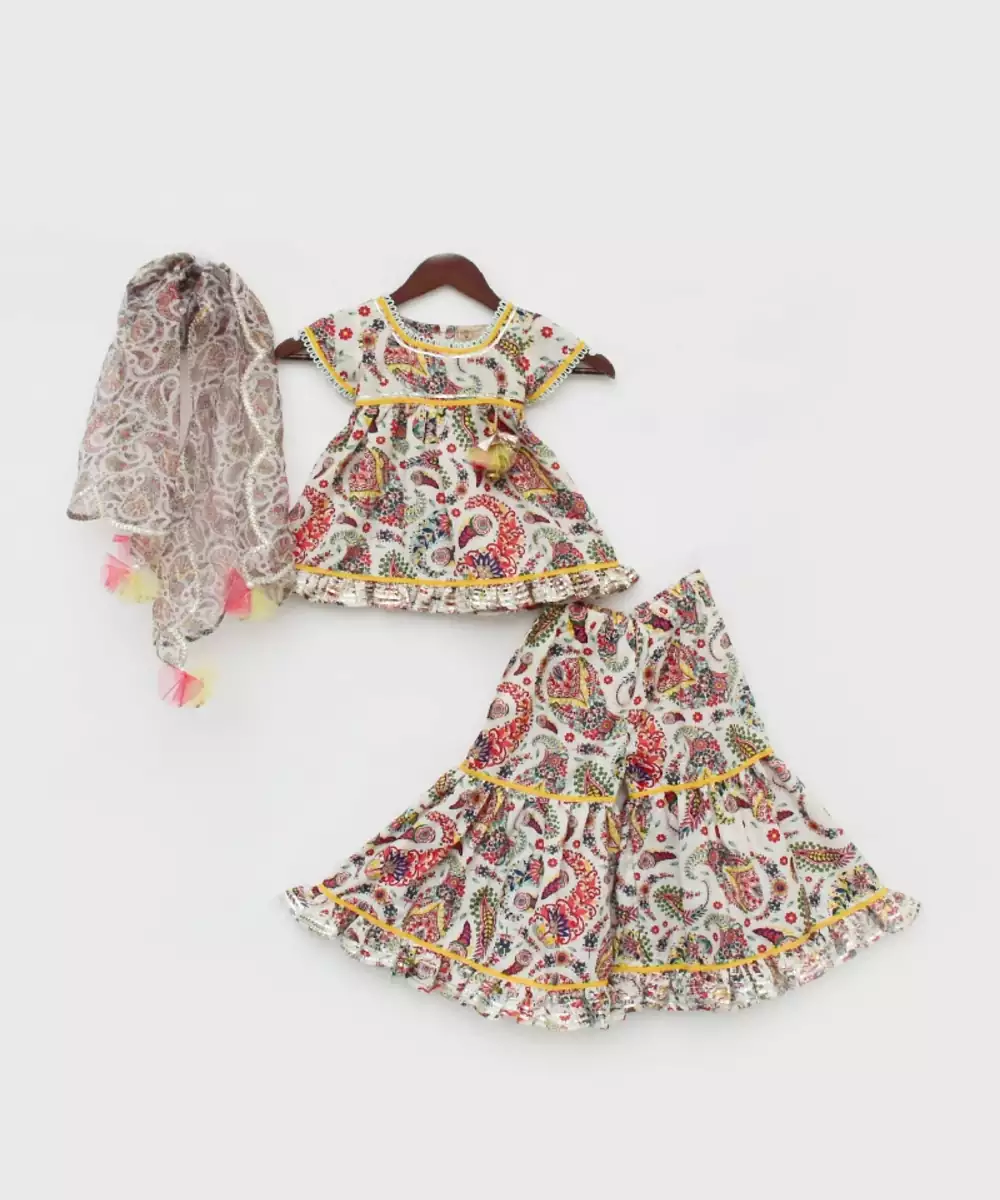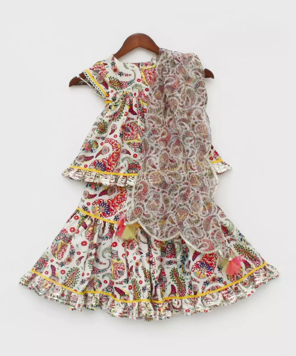 Floral Printed Kurti Sharara, Style It The Way You Like And Match It With Accessories, Bangles, And Mojdi.Printed Kurti Sharara Without Lininground Neck And Zip At Backcape Sleevesfinishing Laces In All Over Outfitprinted Frill In Kurti And Shararaprinted Organza Dupatta With Silver Finishingtassels Attached In Dupattatop : Floral Print Kurti.