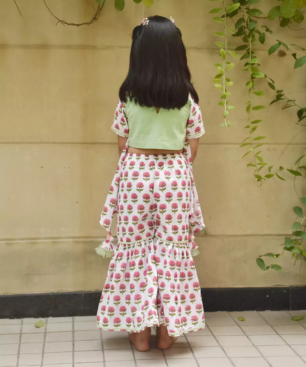 Sharara Set Featuring Mirror Embroidery Top Paired With Printed Sharara And Printed Cape With Lace And Tassels Finishing. Perfect For Any Festive Occasion, From Weddings To Special Gatherings.