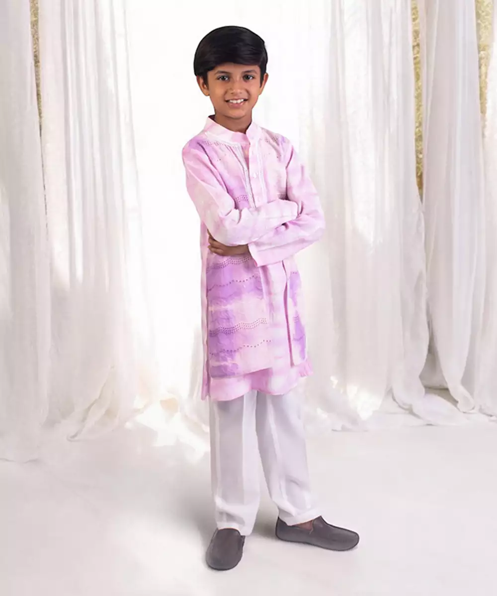 This Stylish Set Includes A Lilac Tie & Dye Schiffli Jacket With A Comfortable Cotton Lining, A Matching Tie & Dye Kurta Without Lining Featuring Lace Finishing On The Placket And Shell Buttons, And An Off White Pant.