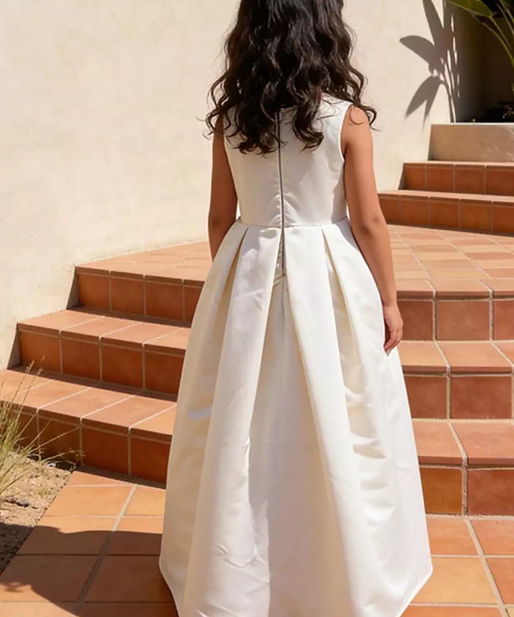 This Off White Luxe Satin Gown Exudes Elegance With Its Smooth Texture And Soft Sheen. The Flowing Silhouette Enhances Its Graceful Appeal, Making It Perfect For Special Occasions. Pair It With Subtle Accessories For A Refined And Timeless Look.