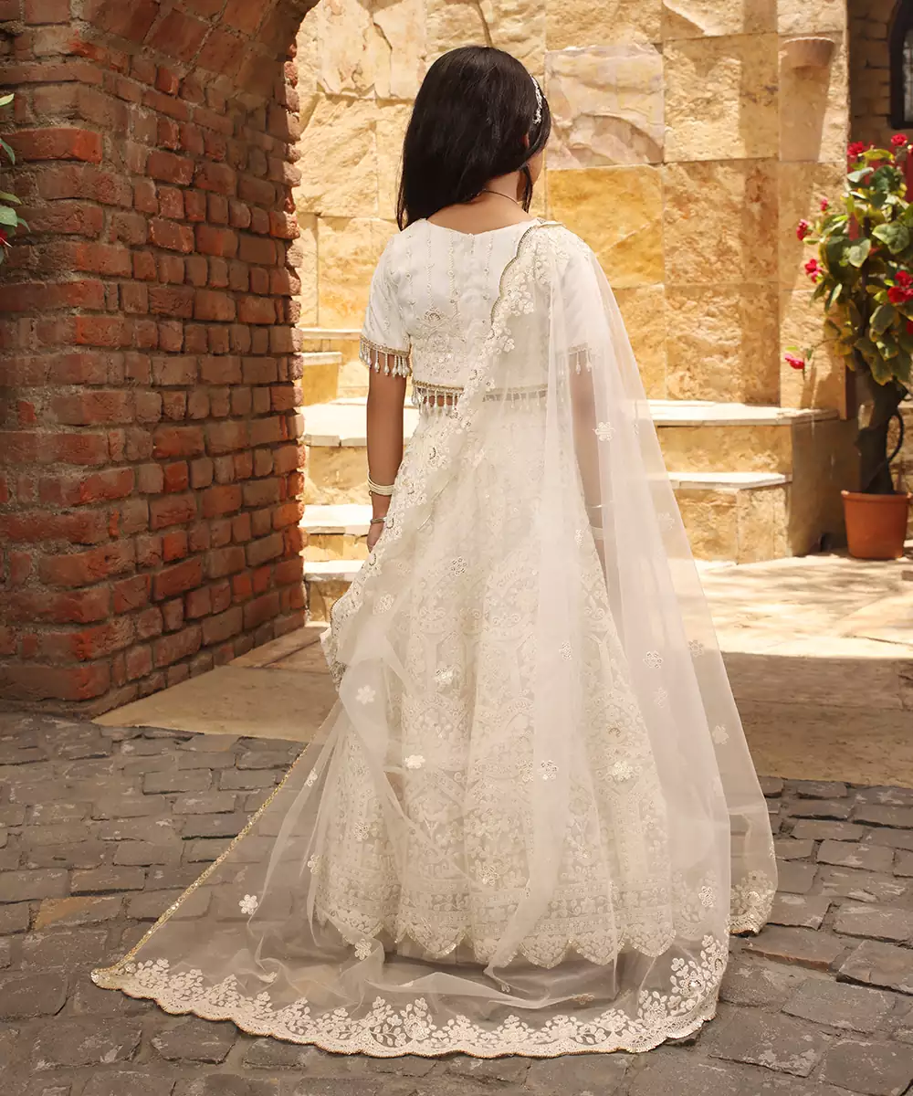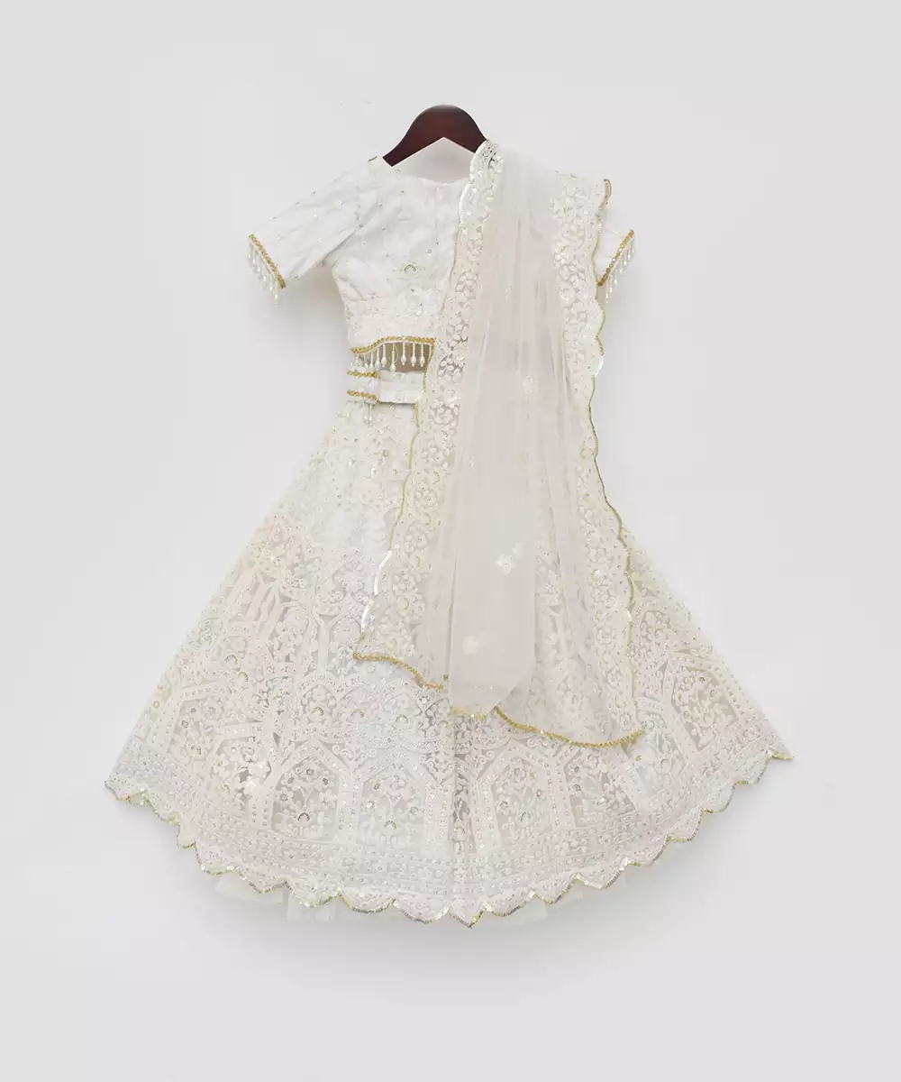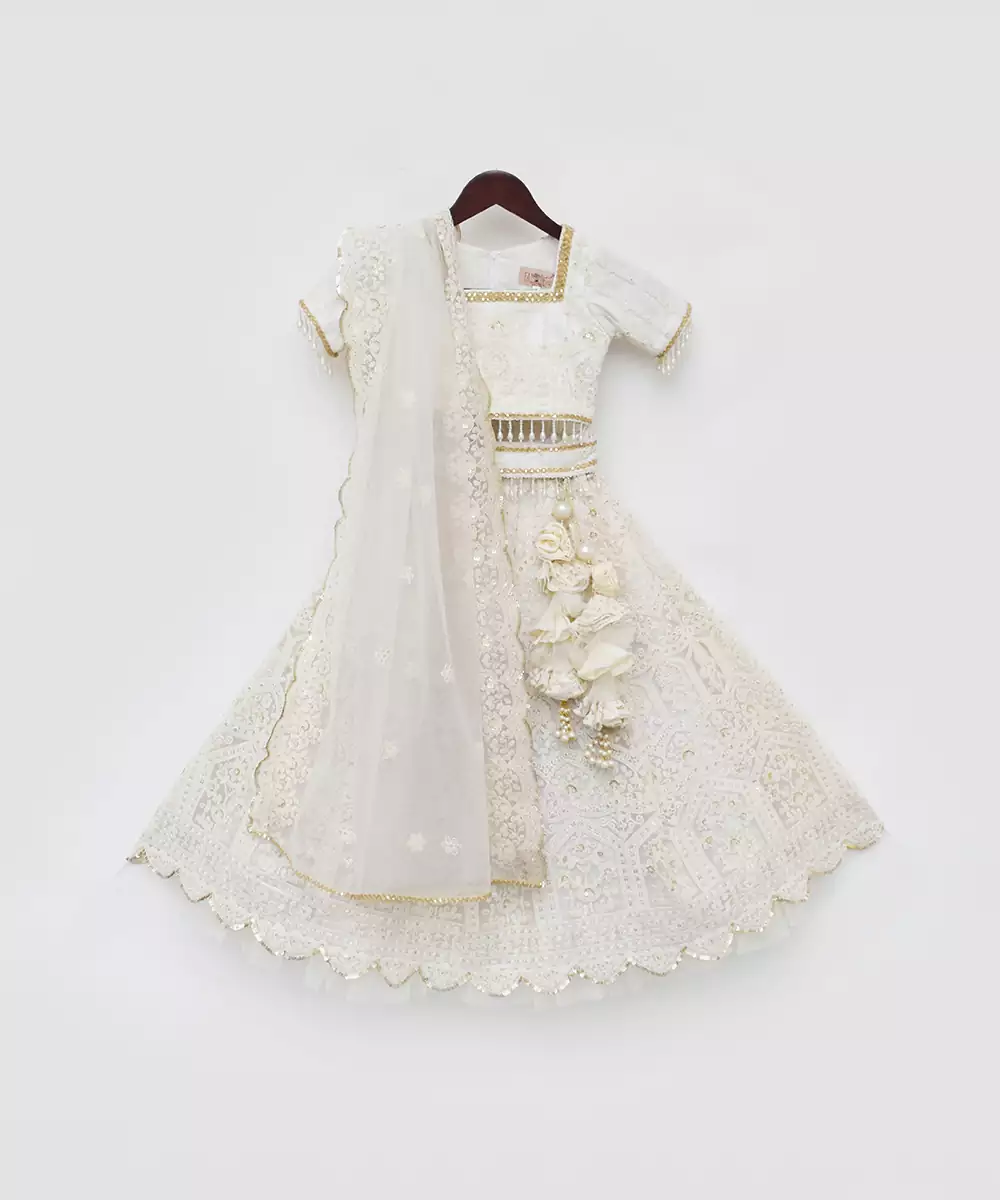 Experience The Enchantment Of Our Off White Sequence Embroidery Lehenga Choli, Featuring An Ivory Thread And Sequence Embroidered Choli With Delicate Bead Tassels And Soft Lining. The Outfit Is Elevated With An Embroidered Belt Adorned With Heavy Tassels, A Thread And Sequence Embroidered Lehenga With A Graceful Net Frill, And A Mesmerizing Thread And Sequence Net Embroidered Dupatta With Scallop Detailing. Let The Outfit Speak For Itself And Make A Statement At Any Special Occasion, Be It A Wedding, Reception, Or Festive Celebration.