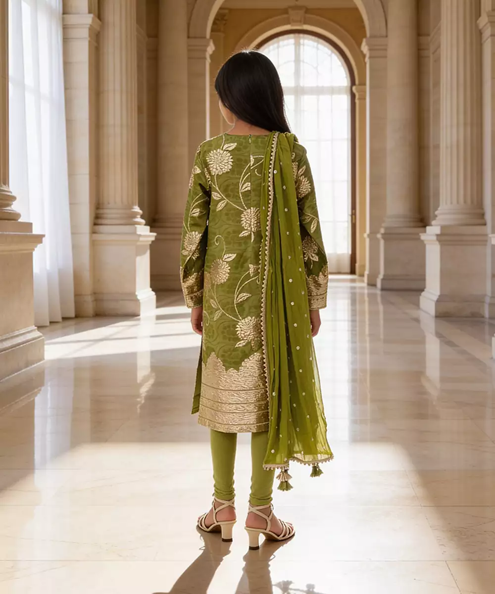 This Olive Green Brocade Suit Set Features Intricate Embroidery That Enhances Its Rich And Traditional Charm. The Textured Fabric Adds Depth, While The Silhouette Ensures A Graceful Fit. Perfect For Festive Occasions, It Pairs Beautifully With Statement Jewelry For A Refined And Elegant Look.