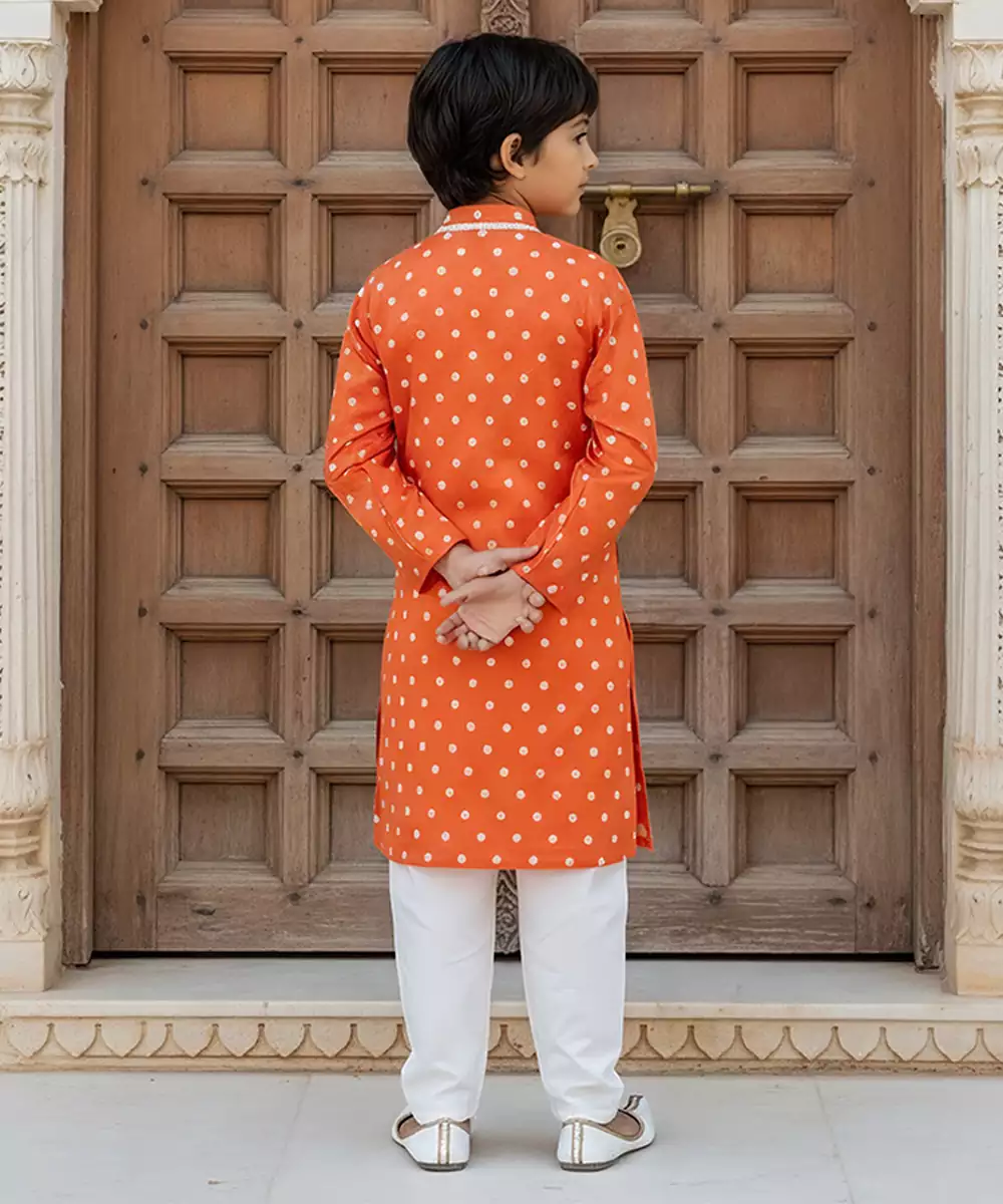 This Orange Embroidered Chanderi Kurta Pyjama Exudes Classic Elegance And Festive Charm. Crafted From Lightweight Chanderi Fabric, It Features Intricate Embroidery That Adds A Refined Touch. Perfect For Weddings And Celebrations, It Offers Graceful Style, Comfort, And Timeless Traditional Appeal.