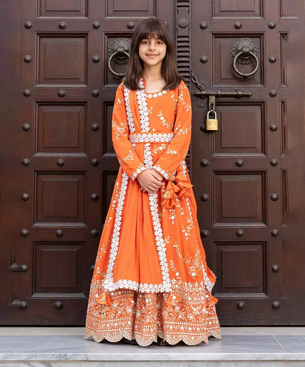 This Orange Georgette Anarkali Set Showcases Intricate Embroidery That Enhances Its Vibrant Charm. The Lightweight Fabric Drapes Beautifully, Creating A Graceful And Flowy Silhouette. Ideal For Festive Occasions, It Pairs Effortlessly With Statement Jewelry For A Radiant And Elegant Look.