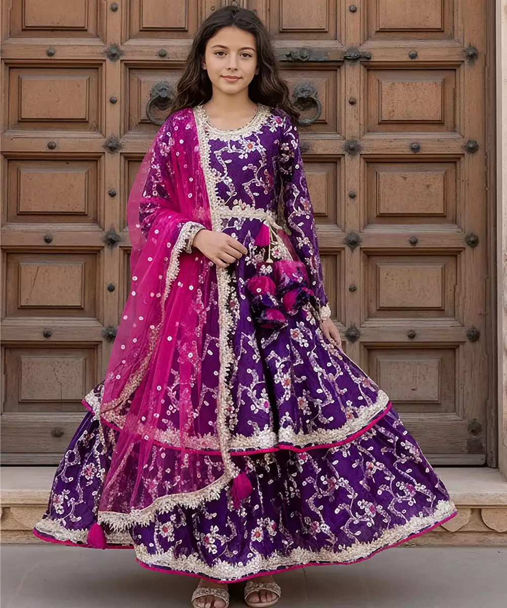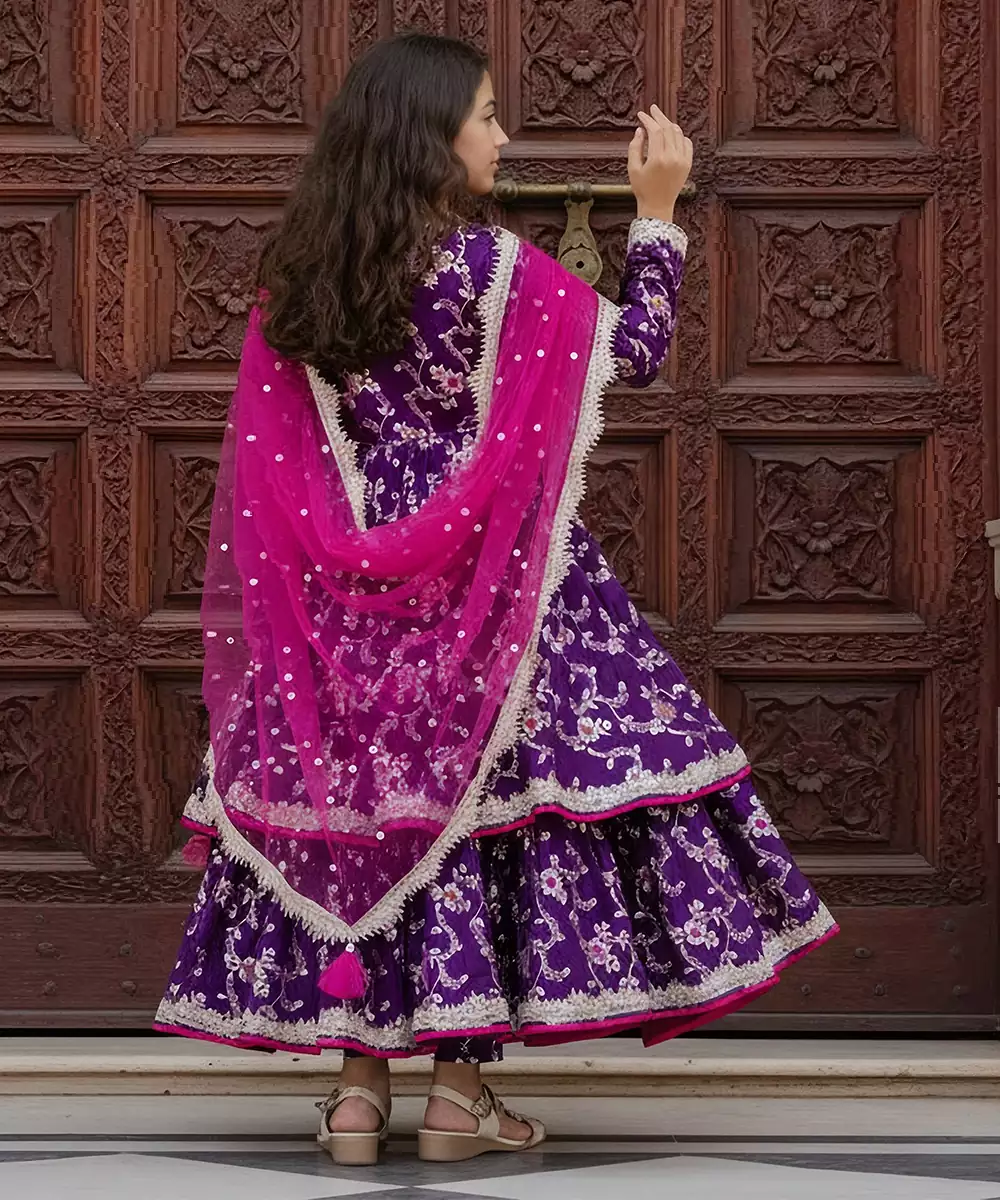 This Purple Embroidered Brocade Anarkali Set Exudes Royal Charm. Crafted From Rich Brocade Fabric And Enhanced With Detailed Embroidery, It Features A Flared Silhouette For Festive Grandeur. Perfect For Weddings, Receptions, Or Festive Celebrations, This Set Combines Tradition And Elegance, Offering A Luxurious Ensemble That Leaves A Lasting Impression.