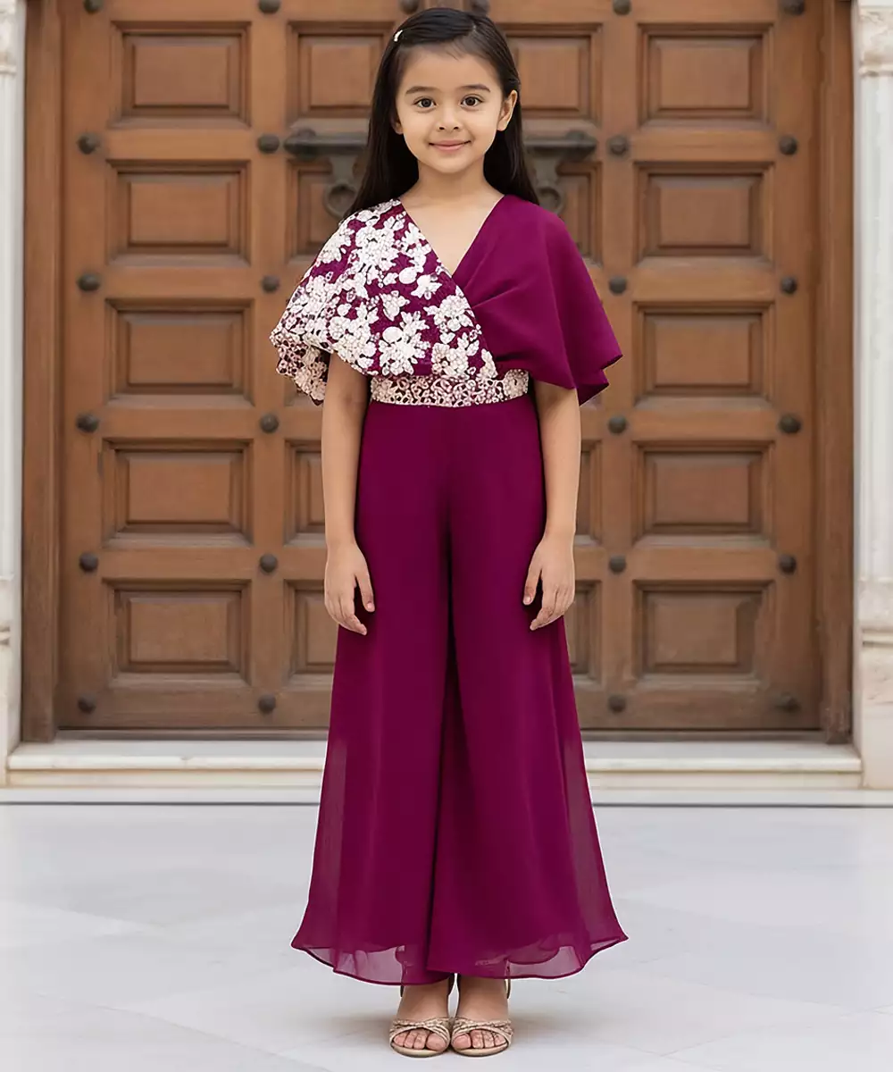 This Purple Embroidered Georgette Jumpsuit Offers A Modern Twist On Traditional Elegance. Lightweight Georgette Fabric And Intricate Embroidery Create A Chic Festive Ensemble. Perfect For Weddings Or Cocktail Events, The Tailored Silhouette Ensures A Flattering Fit, While The Vibrant Color And Delicate Detailing Make It A Stylish Choice For Contemporary Celebrations.