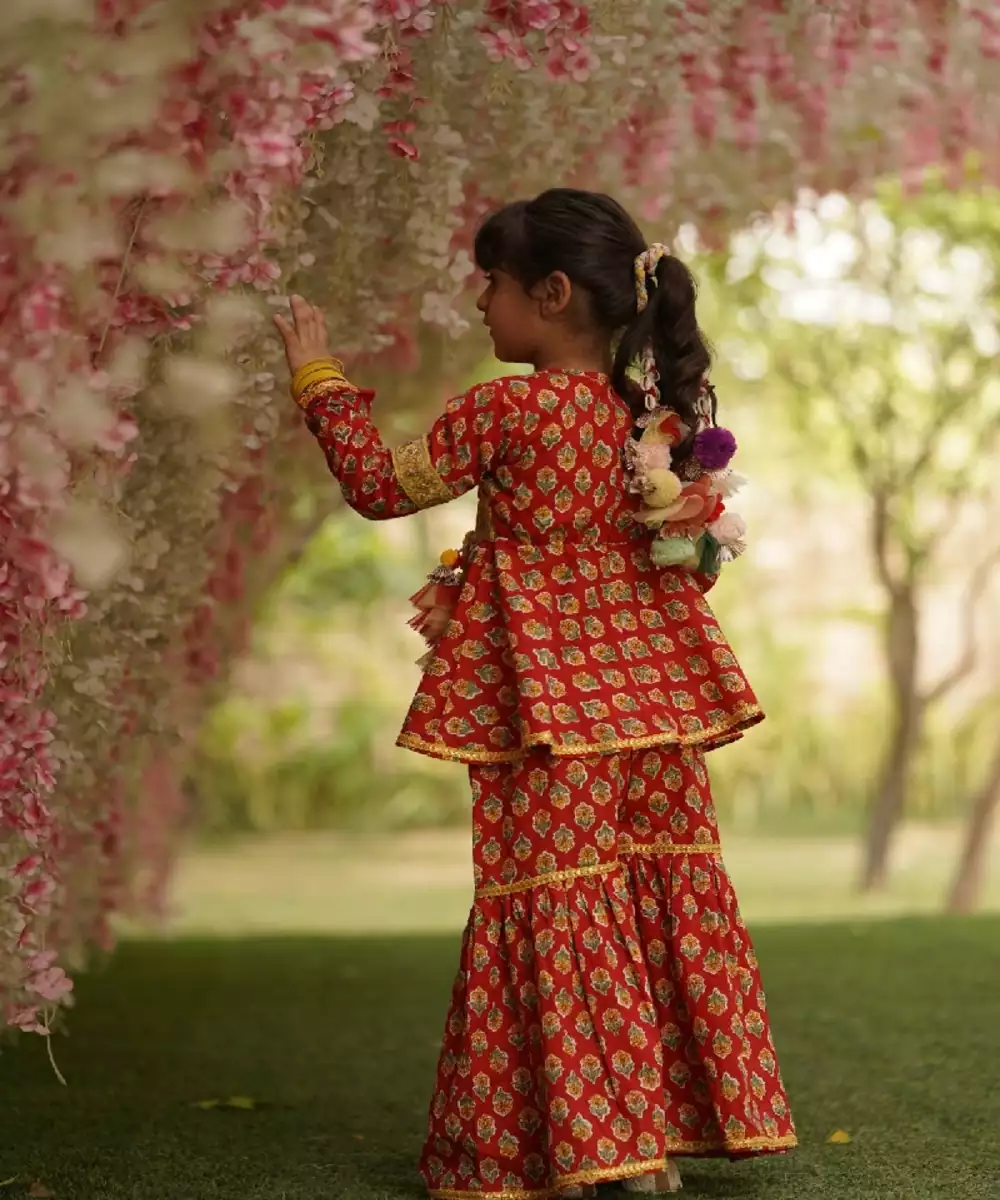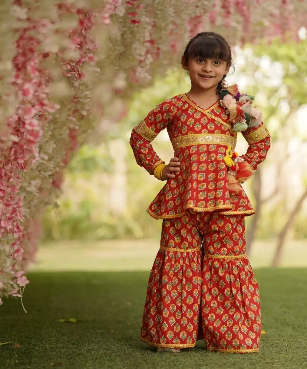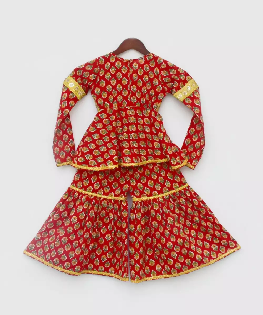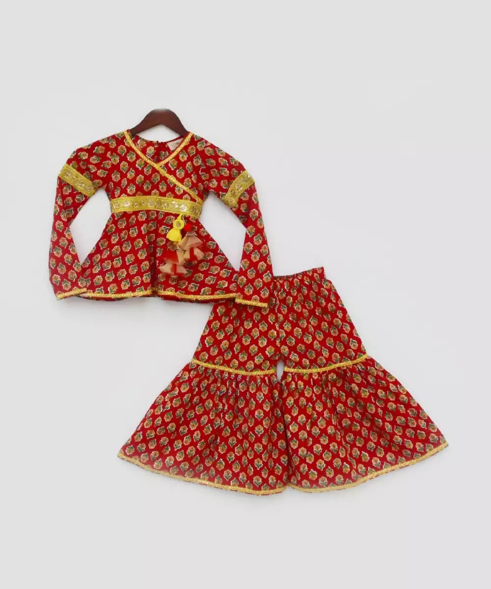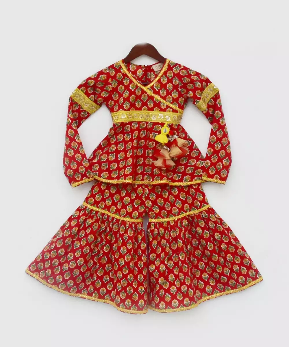 Bangles, Mojdi And Be Style Ready.Red Printed Kurti Without Liningv Neck And Zip At Backfull Sleevesyellow Finishing All Over Outfit Tassels Attached On One Sidesharara Without Liningall Over Elastic In Sharara Top : Red Printed