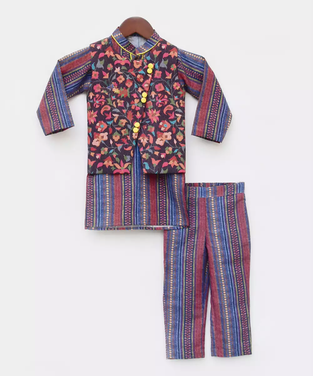 Printed Nehru Jacket With Kurta And Pant, A Smart Yet Comfortable Pick For Your Little Heroes.Printed Nehru Jacket With Soft Liningself Buttons And Motif On Pocketprinted Kurta Without Liningyellow Finishing On Kurta Placketprinted Pant Without Liningtop : Printed Nehru Jacket With Kurta.