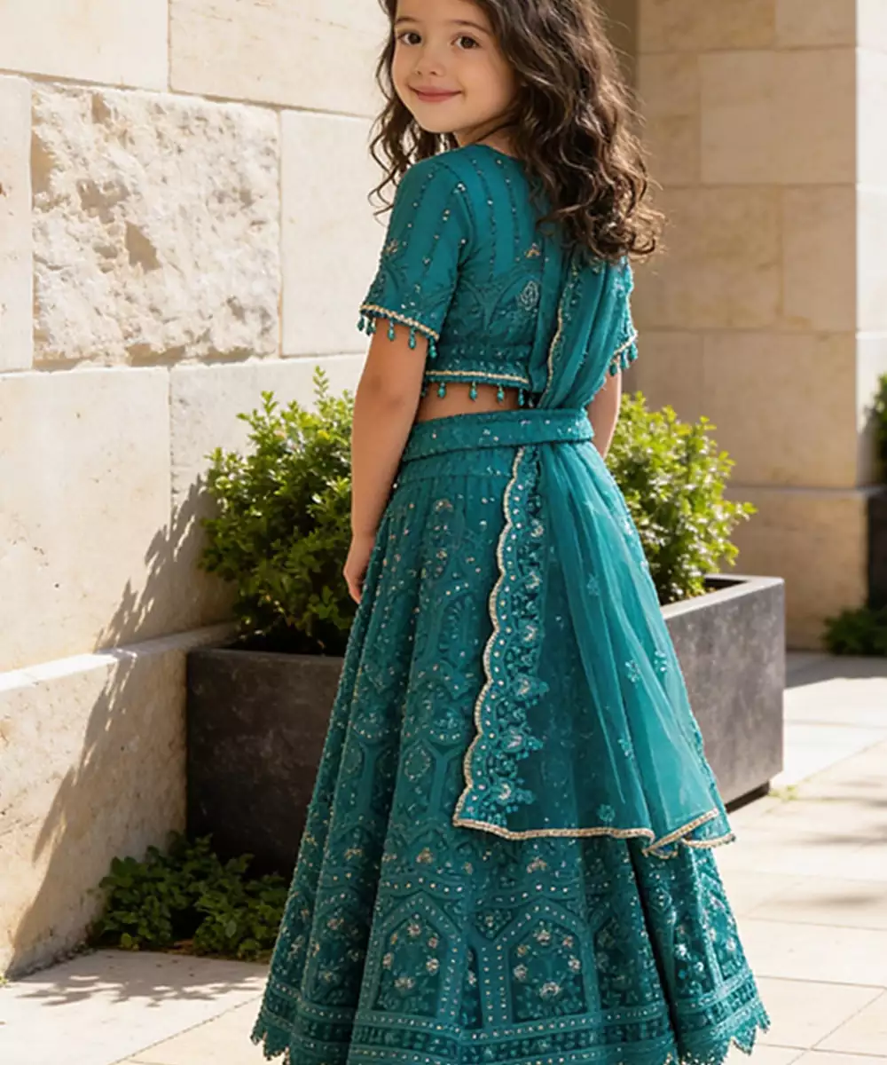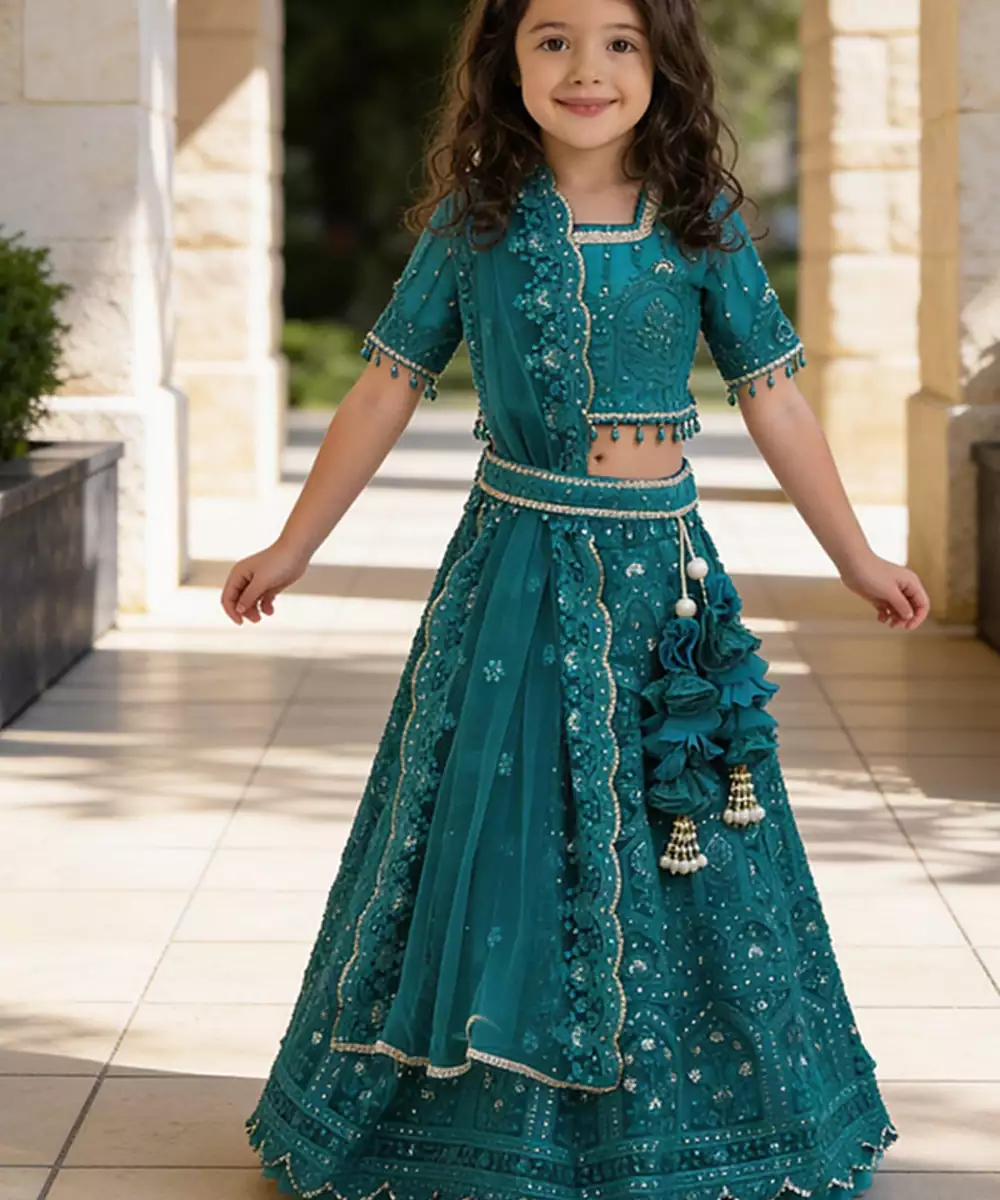 This Teal Blue Net Lehenga Set Features Intricate Embroidery That Enhances Its Vibrant Yet Elegant Appeal. The Lightweight Fabric Creates A Soft And Flowy Silhouette, Ensuring Comfort And Style. Perfect For Festive Occasions, It Pairs Beautifully With Statement Accessories For A Refined And Graceful Look.