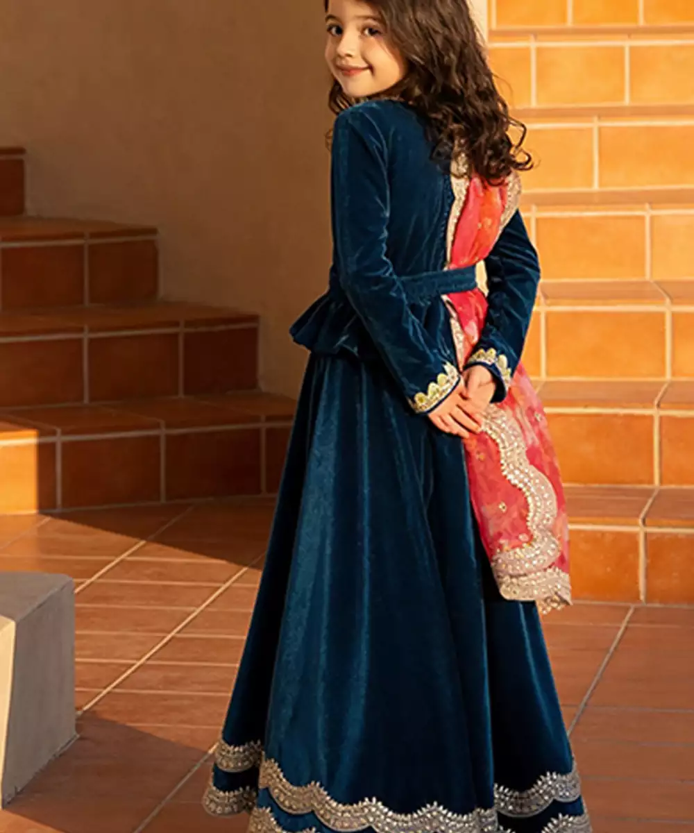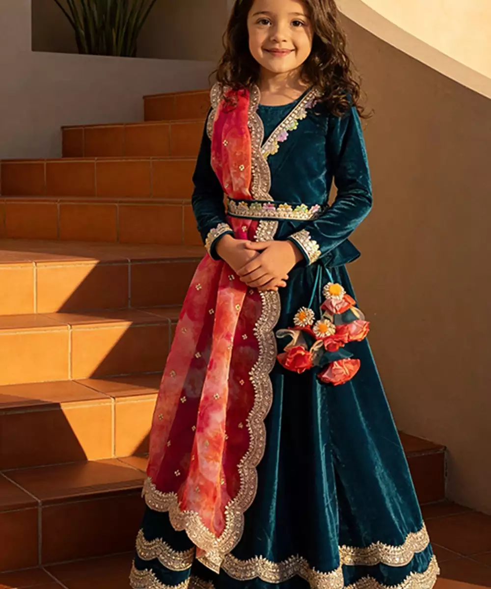 This Teal Blue Velvet Lehenga Set Features Rich Embroidery That Enhances Its Luxurious Appeal. The Plush Fabric Adds Depth And Warmth, While The Structured Silhouette Creates Elegance. Perfect For Grand Celebrations, It Pairs Beautifully With Statement Jewelry For A Bold And Regal Look.