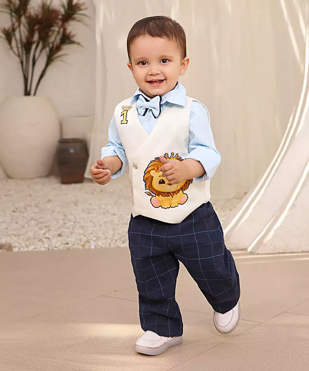 Dress Your Young Gentleman In Dapper Elegance With Our White Waistcoat With Pant And Shirt Set. The Set Includes A Blue Shirt With A Matching Bow Tie, Paired With A White Waistcoat Featuring Soft Lining And Charming Motifs. The Blue Check Pant Adds A Touch Of Sophistication, While The Crown Button On The Waistcoat Adds A Regal Flair. Colour : White